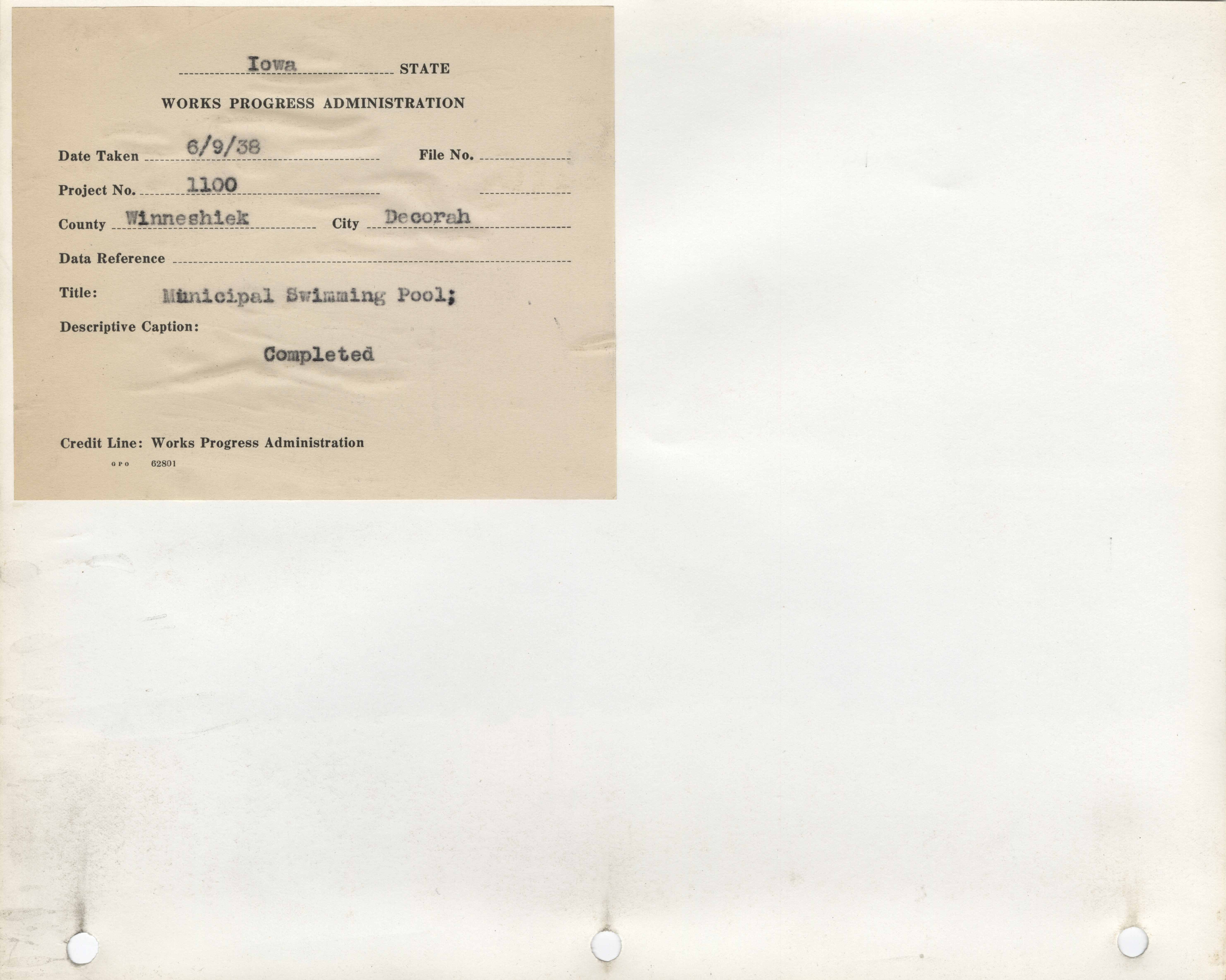 - "Photograph of the municipal swimming pool in Decorah", Work Projects Administration (Iowa) Photographs, Iowa State University Library Digital Collections
