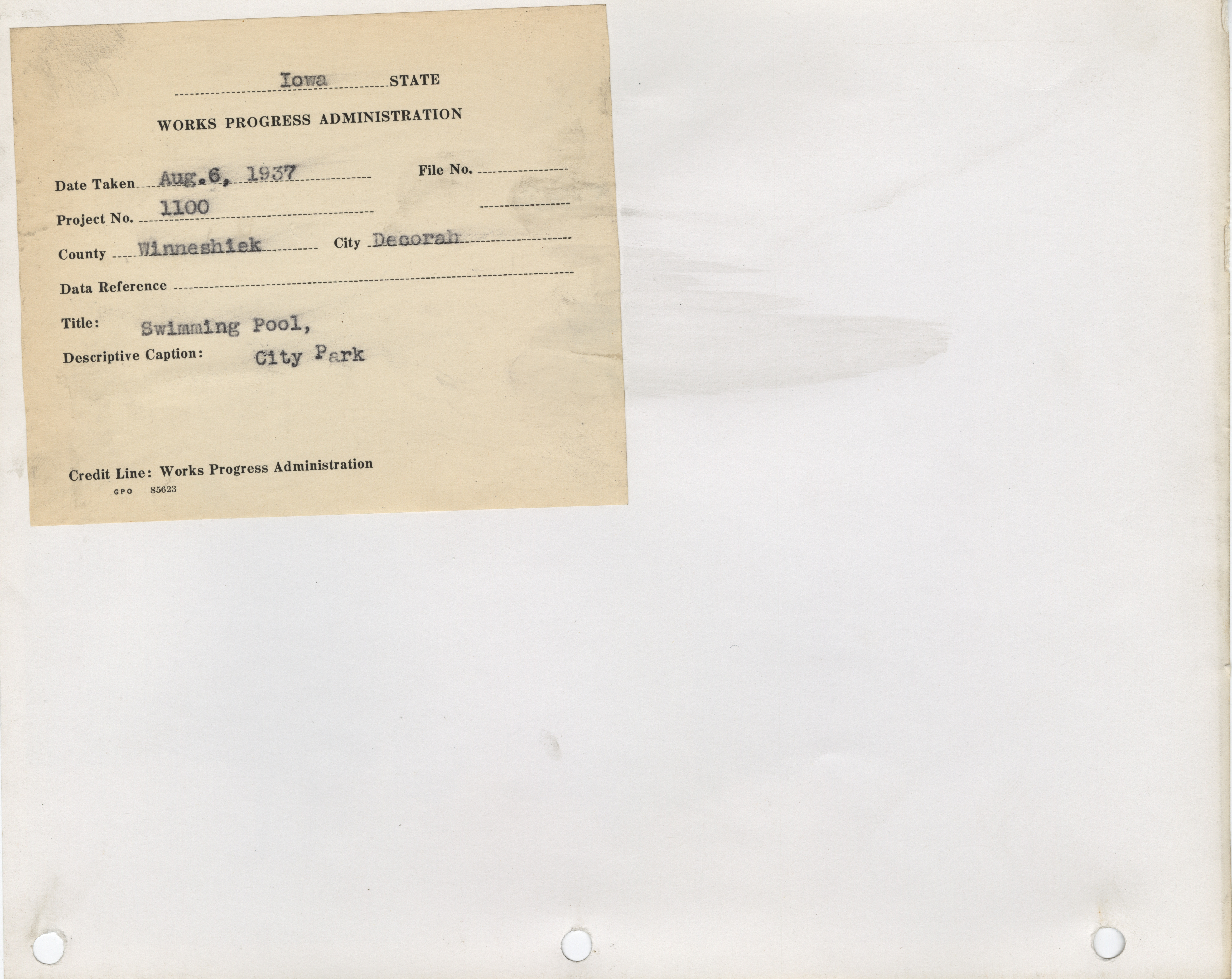 - "Photograph of the swimming pool at the city park in Decorah", Work Projects Administration (Iowa) Photographs, Iowa State University Library Digital Collections
