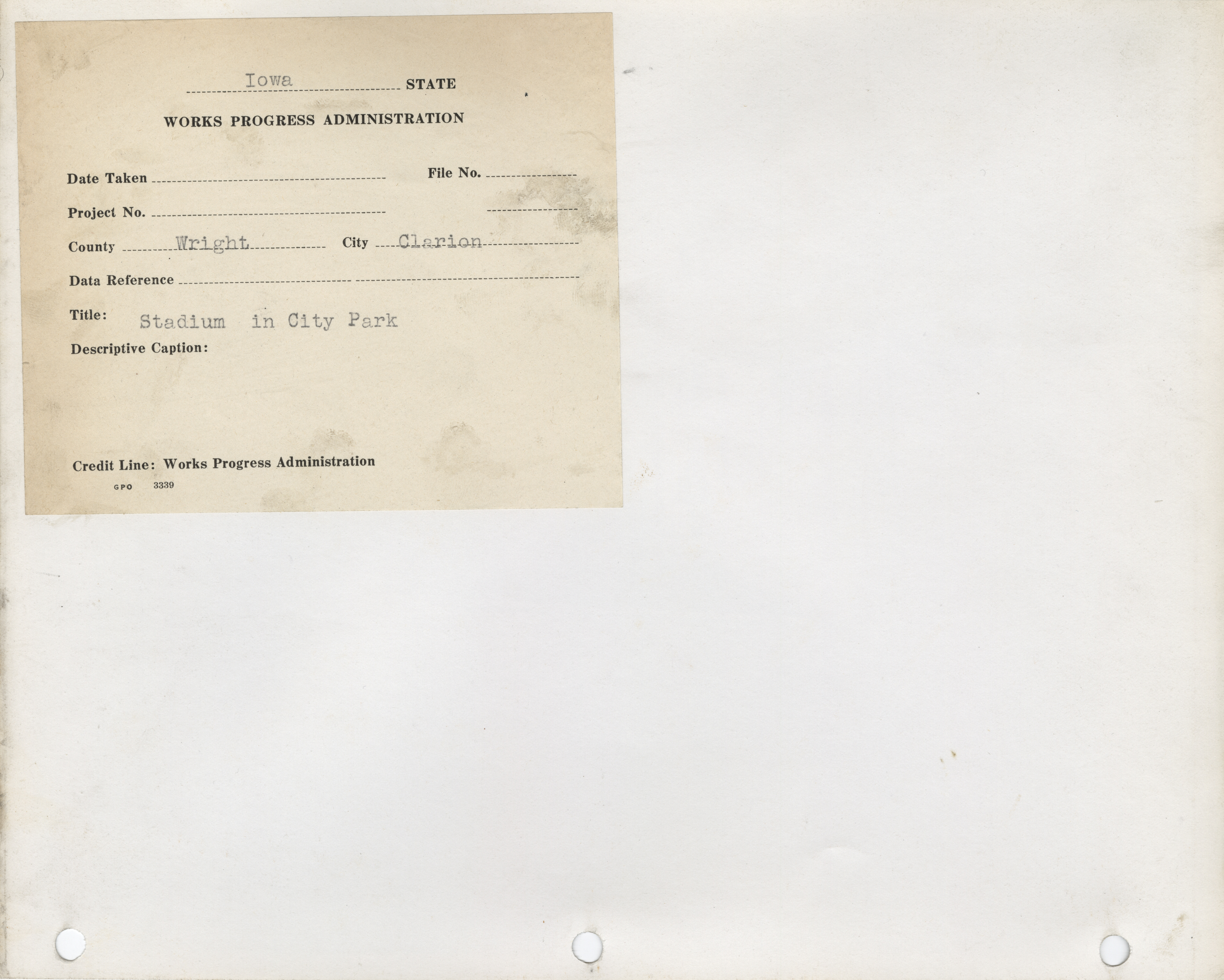 - Stadiums and Swimming Pools. Wright County. Clarion. Stadium in City Park. (3 b/w photographs), undated