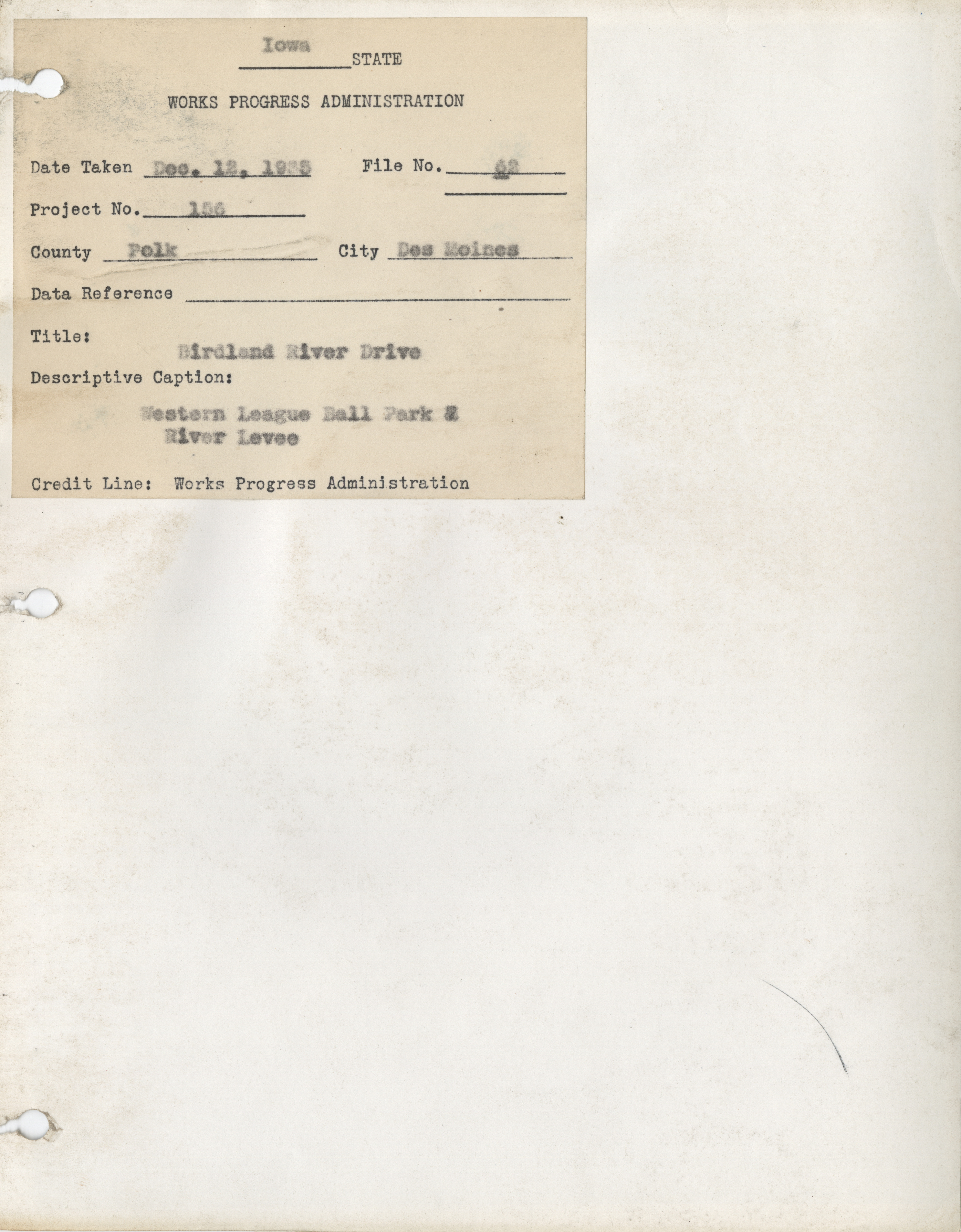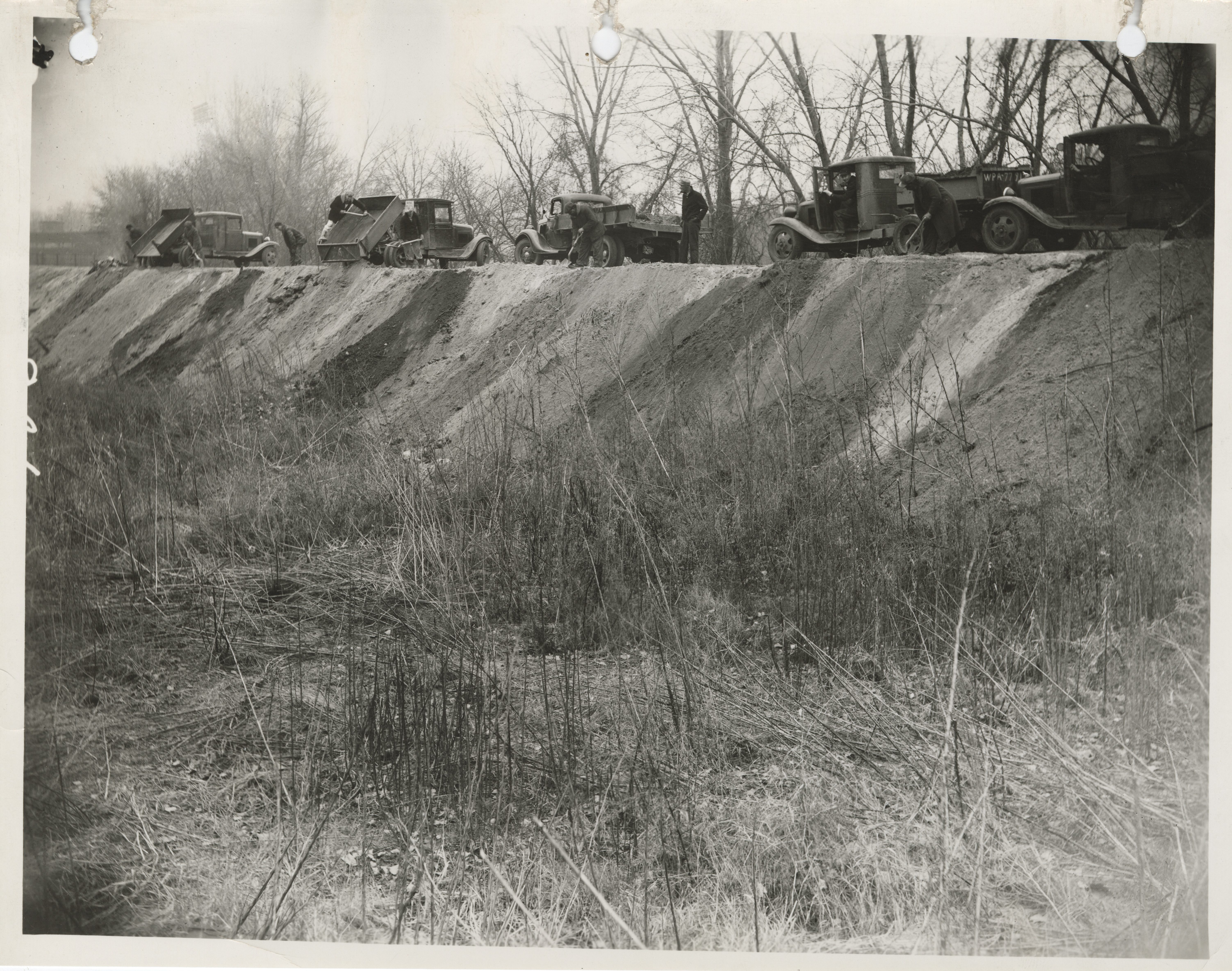 - "Photograph of the construction of levee at the Birdland River drive in Des Moines", Work Projects Administration (Iowa) Photographs, Iowa State University Library Digital Collections