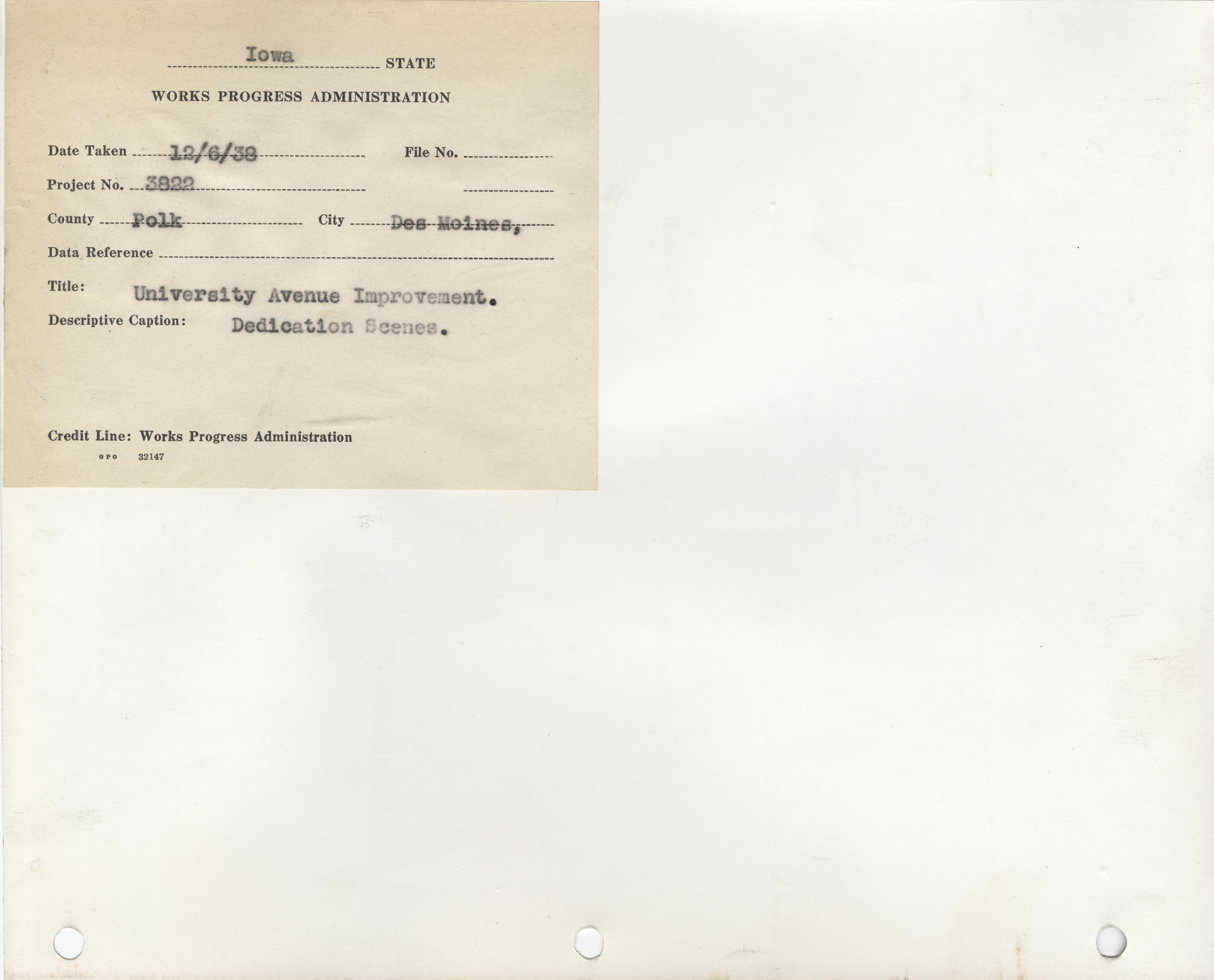 - Streets and Alleys. Polk County. Des Moines. University Avenue Improvements. Includes Some Scenes from Dedication. Project 3822. (6 b/w photographs), 1938