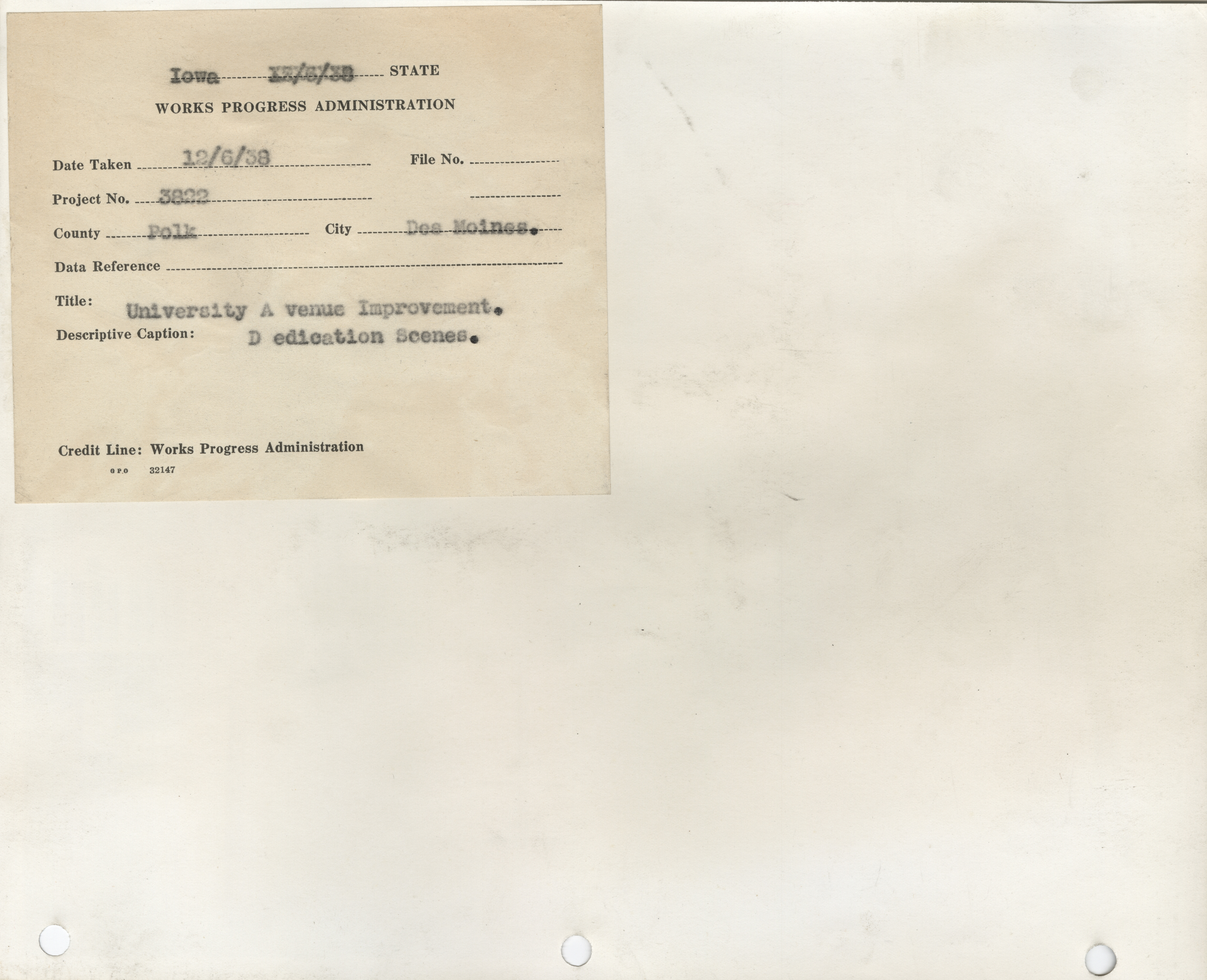 - Streets and Alleys. Polk County. Des Moines. University Avenue Improvements. Includes Some Scenes from Dedication. Project 3822. (6 b/w photographs), 1938