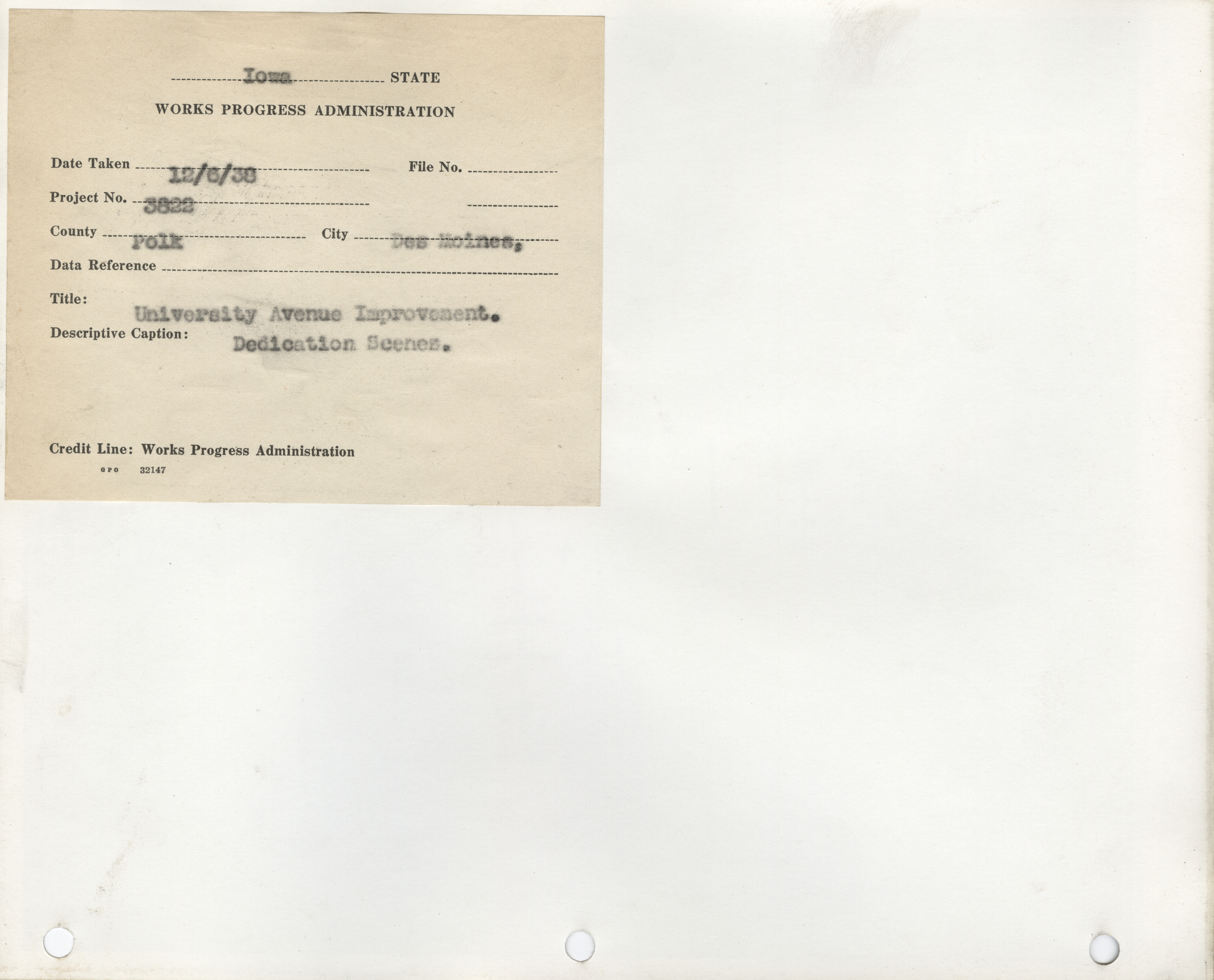 - Streets and Alleys. Polk County. Des Moines. University Avenue Improvements. Includes Some Scenes from Dedication. Project 3822. (6 b/w photographs), 1938