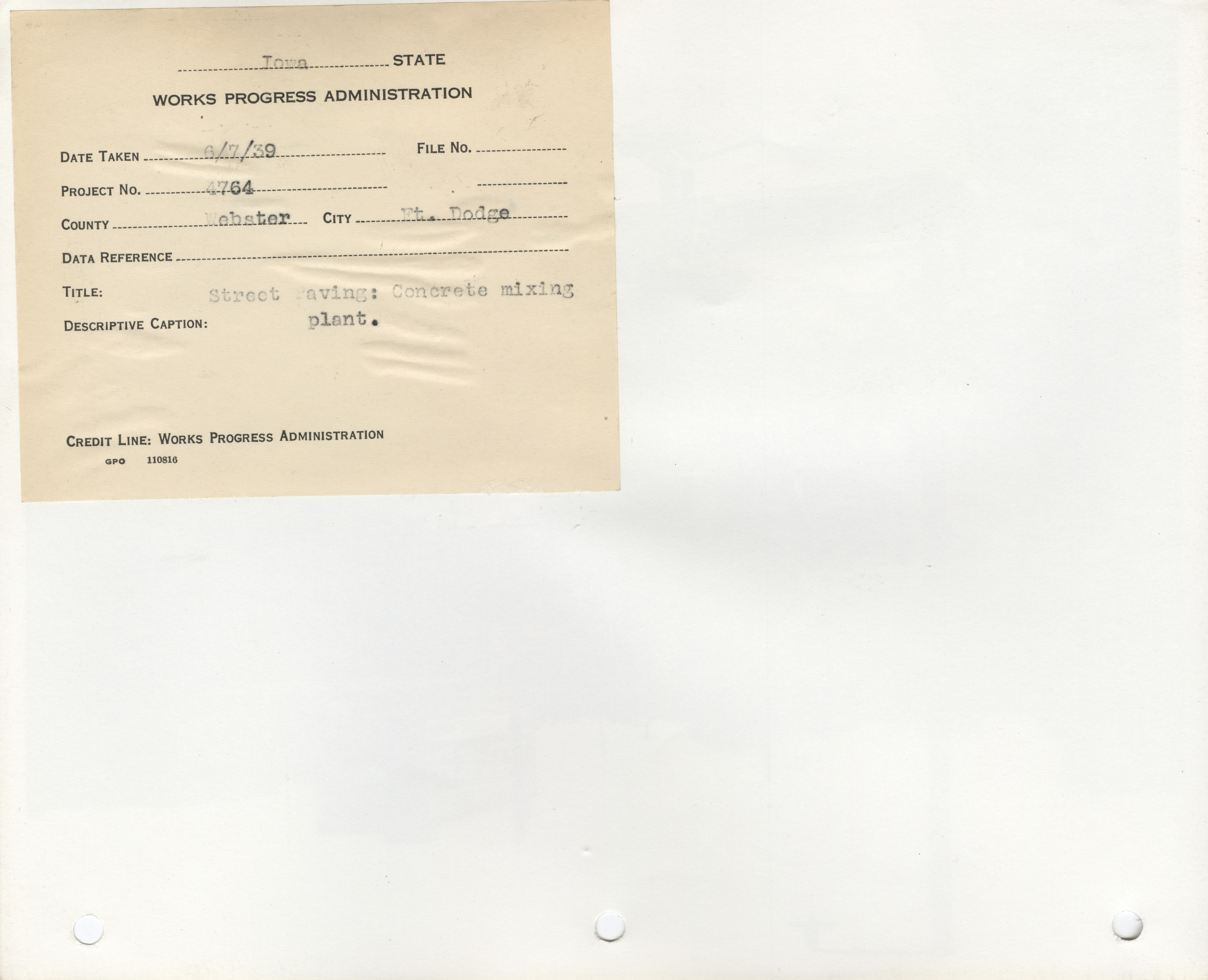 - "Photograph of people working at the concrete mixing plant for street paving in Fort Dodge", Work Projects Administration (Iowa) Photographs, Iowa State University Library Digital Collections