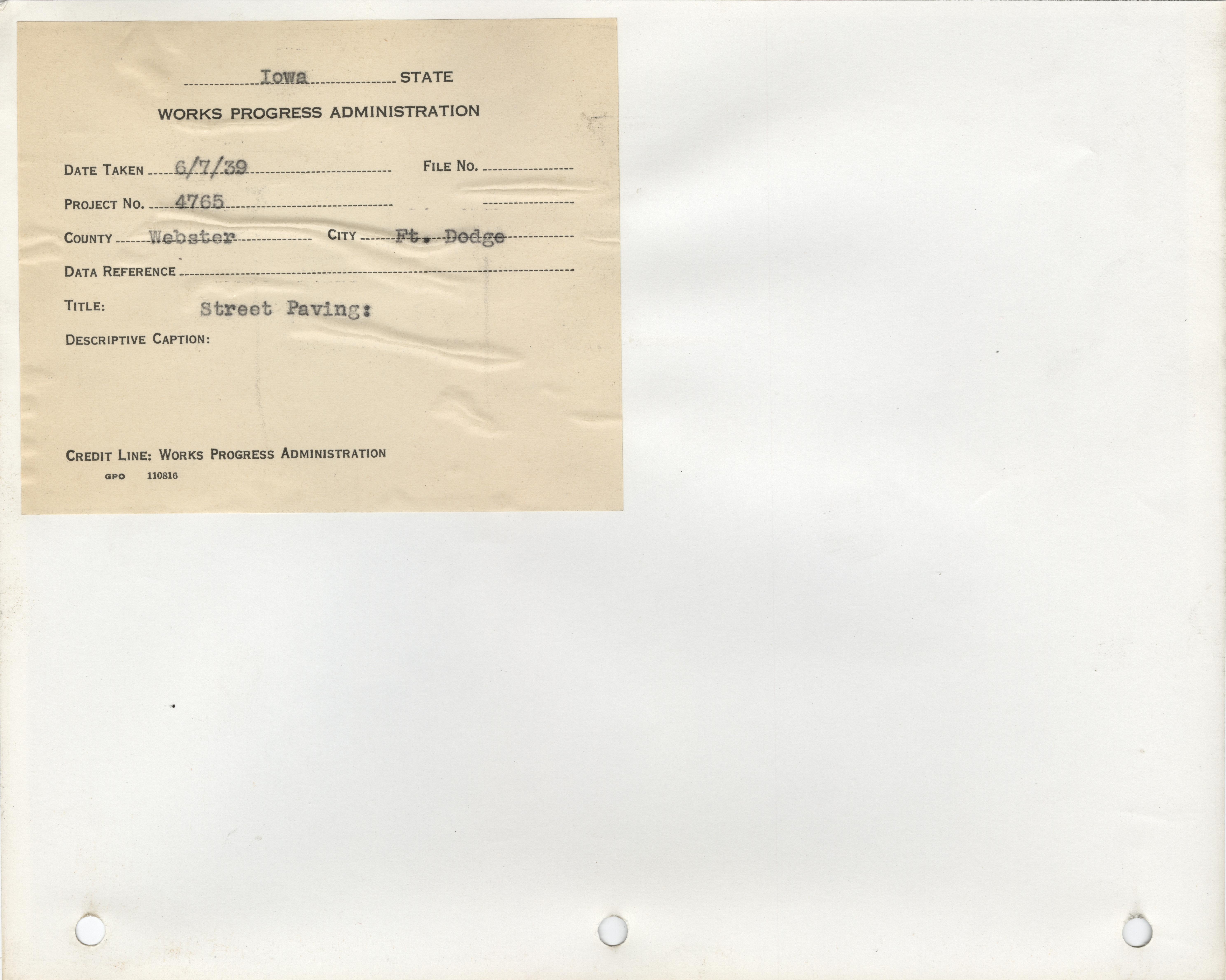 - Streets and Alleys. Webster County. Fort Dodge. Paving City Streets. Project 4765. (3 b/w photographs), 1939
