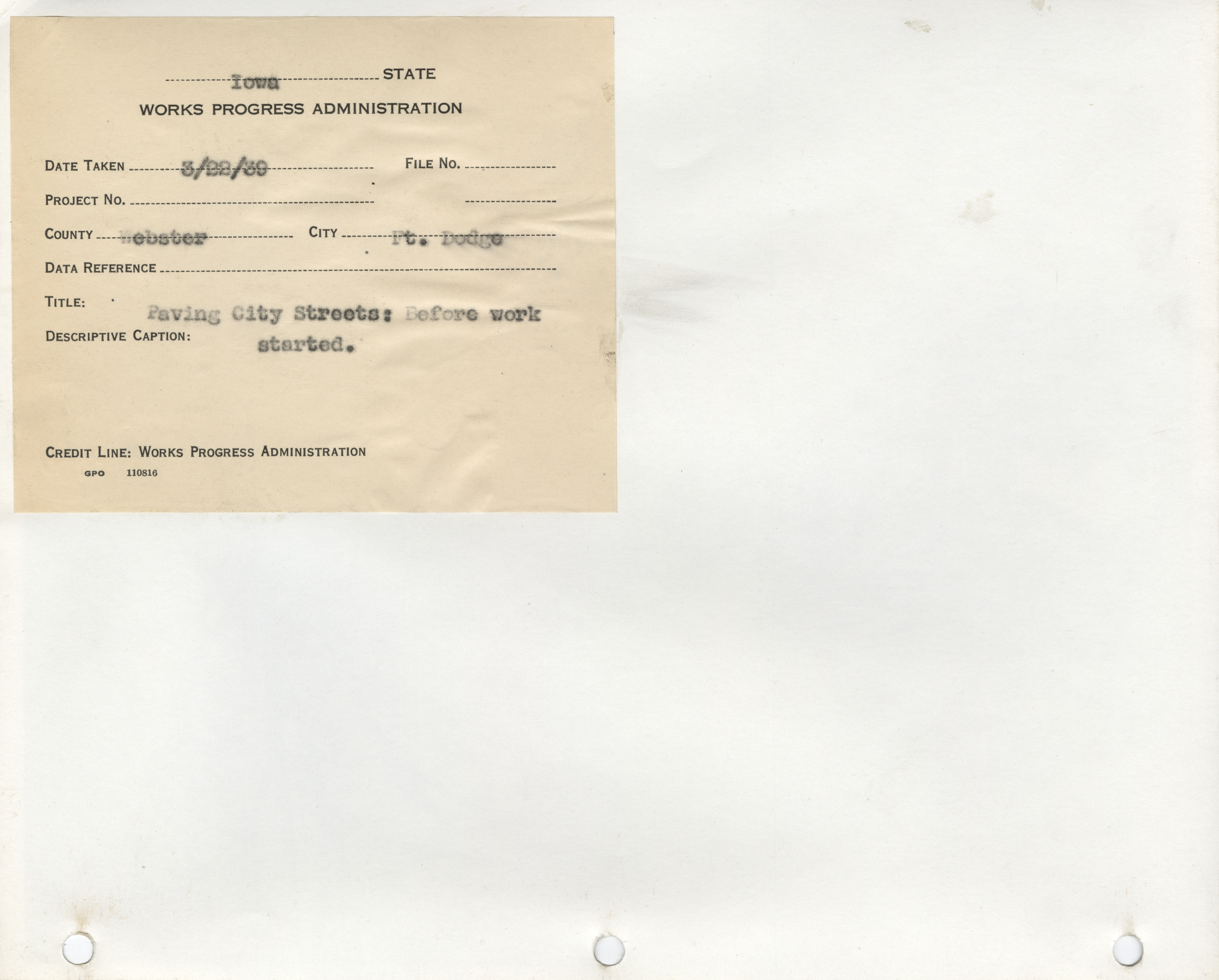 - "Photograph of the city street before the paving work started in Fort Dodge", Work Projects Administration (Iowa) Photographs, Iowa State University Library Digital Collections