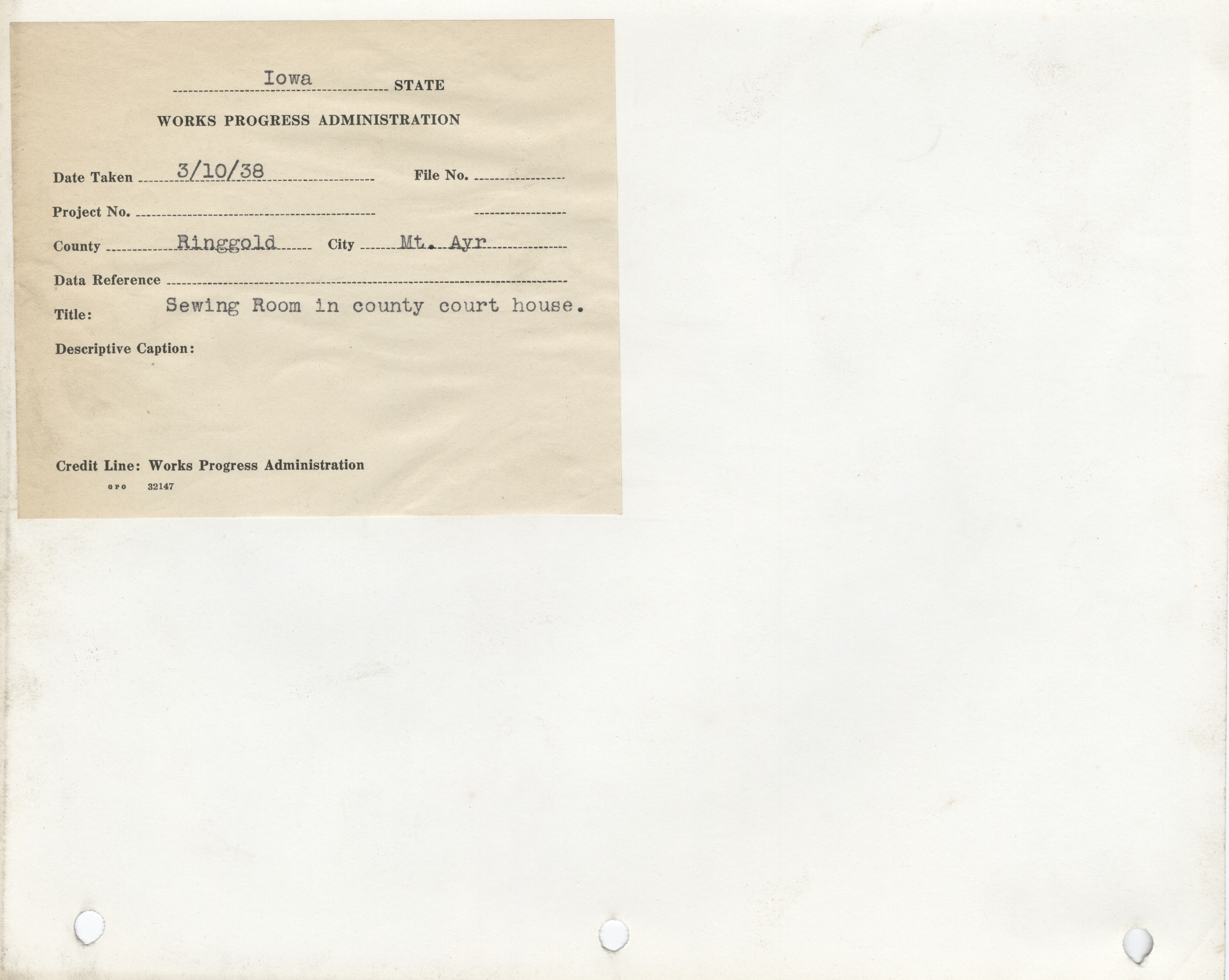 - Sewing Rooms. Ringgold County. Mount Ayr. Sewing Room in County Courthouse. (1 b/w photograph), 1938
