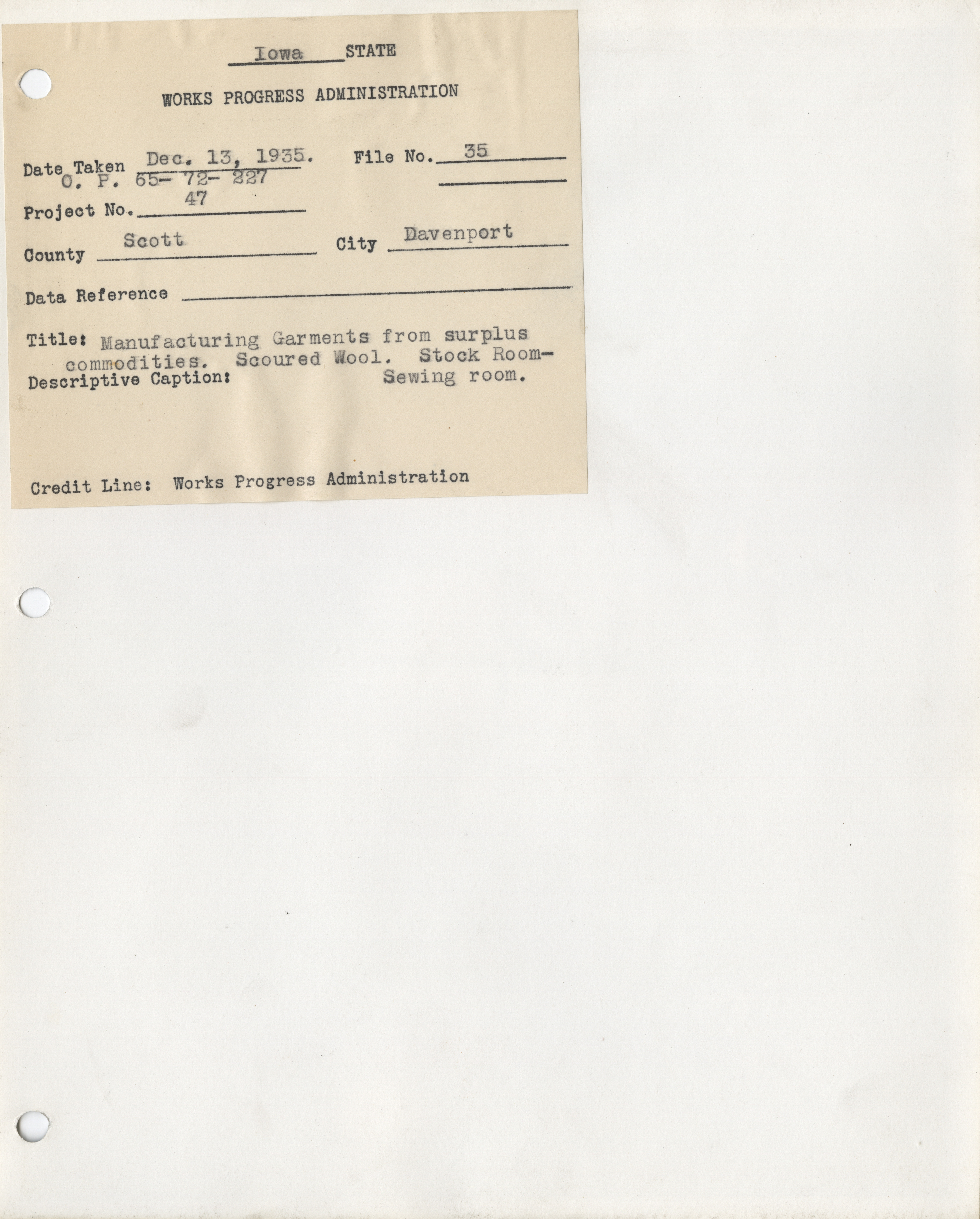 - Sewing Rooms. Scott County. Davenport. Sewing Room. Project 47. (6 b/w photographs), 1935-1938, undated