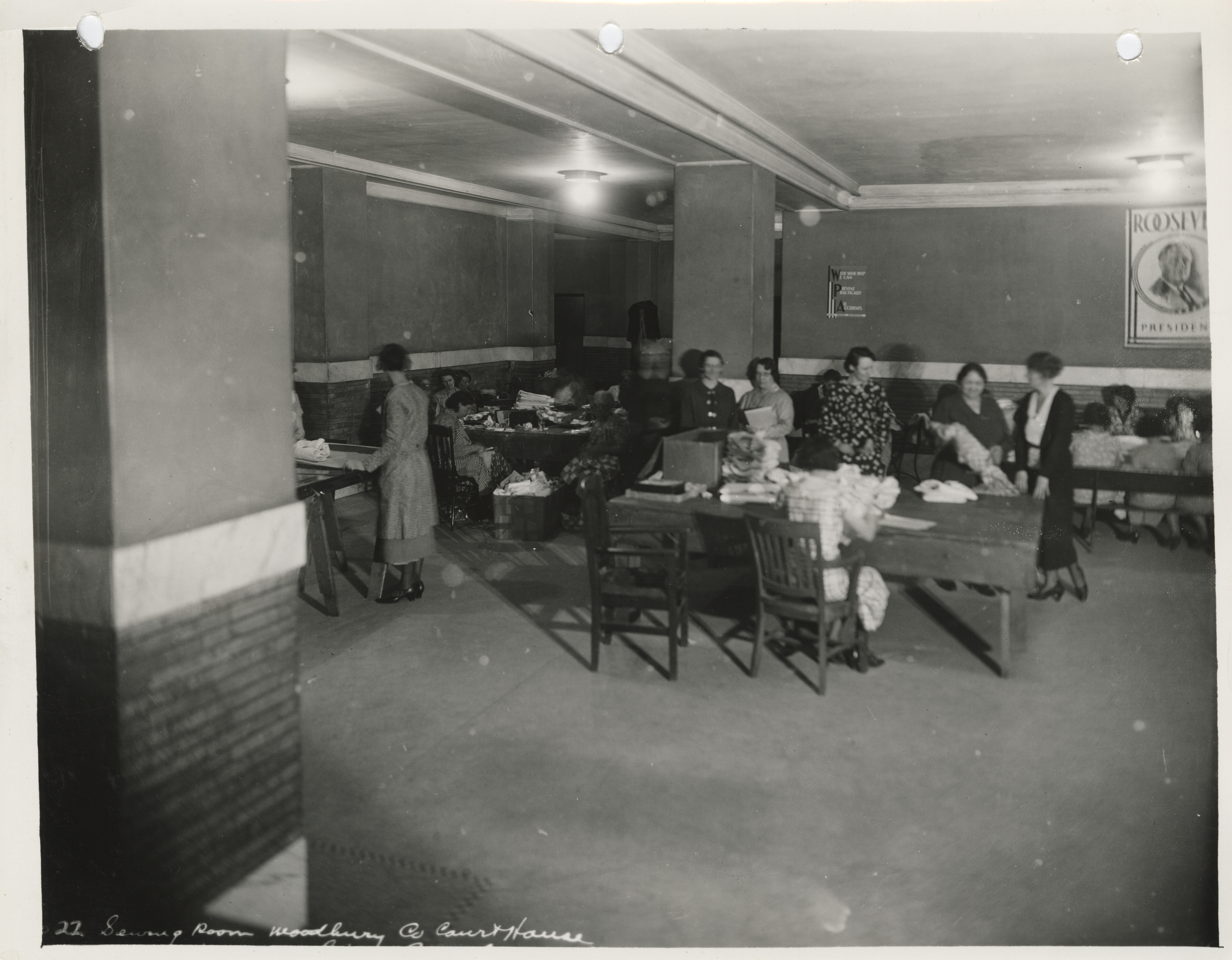 - Photograph of women sewing in the sewing room of the Woodbury County Courthouse in Sioux City