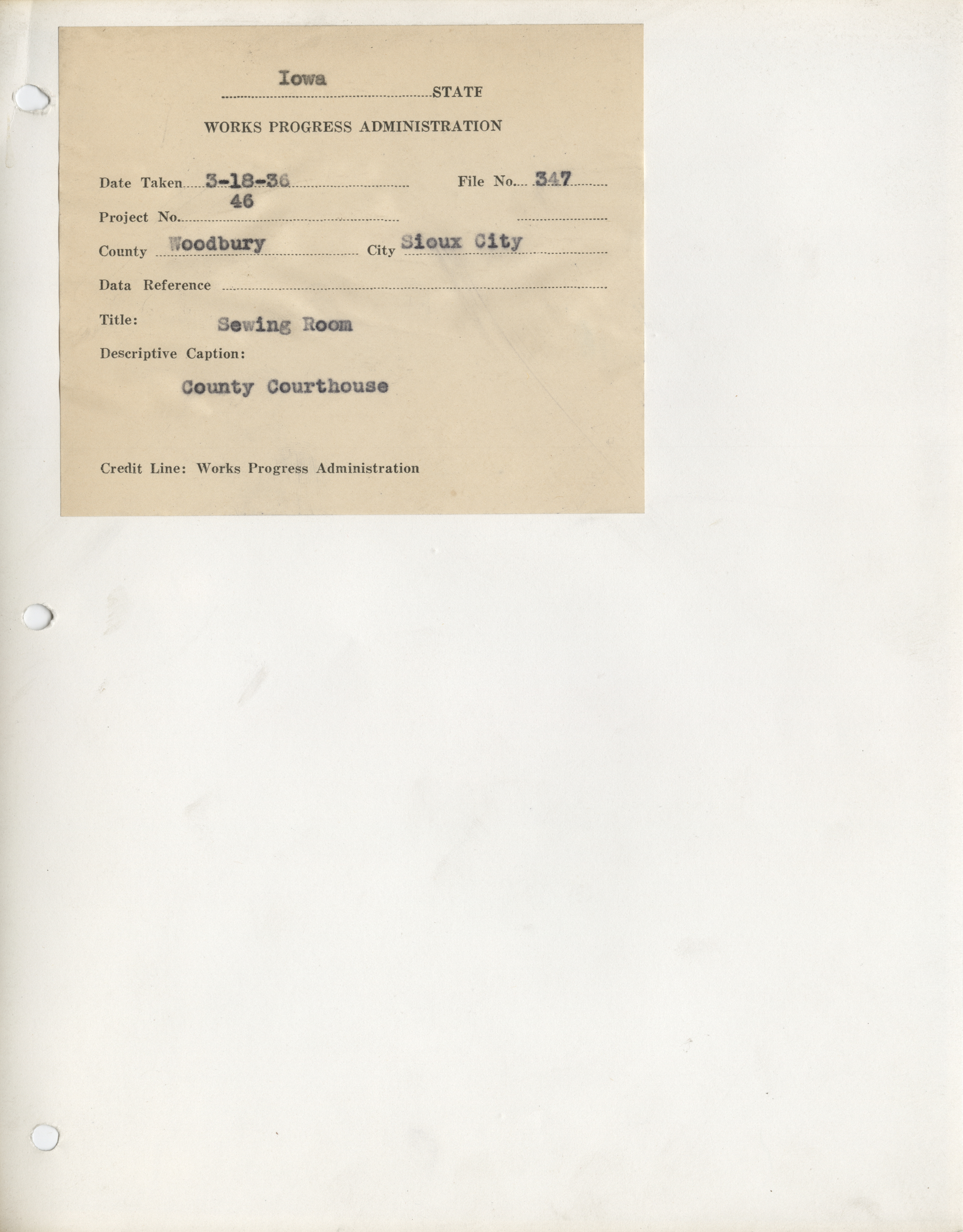 - "Photograph of women sewing in the sewing room of the Woodbury County Courthouse in Sioux City", Work Projects Administration (Iowa) Photographs, Iowa State University Library Digital Collections