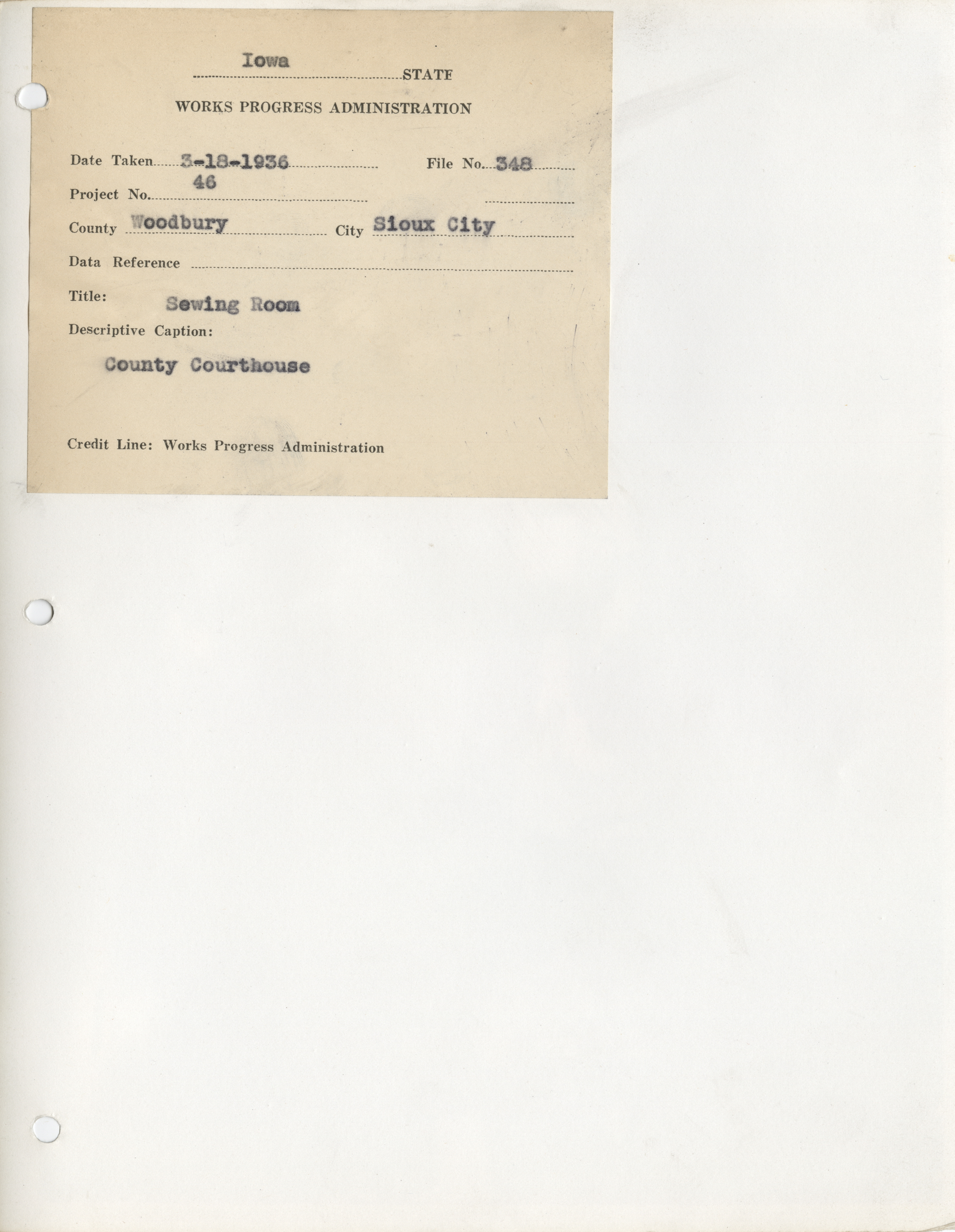 - "Photograph of women sewing in the sewing room of the Woodbury County Courthouse in Sioux City", Work Projects Administration (Iowa) Photographs, Iowa State University Library Digital Collections