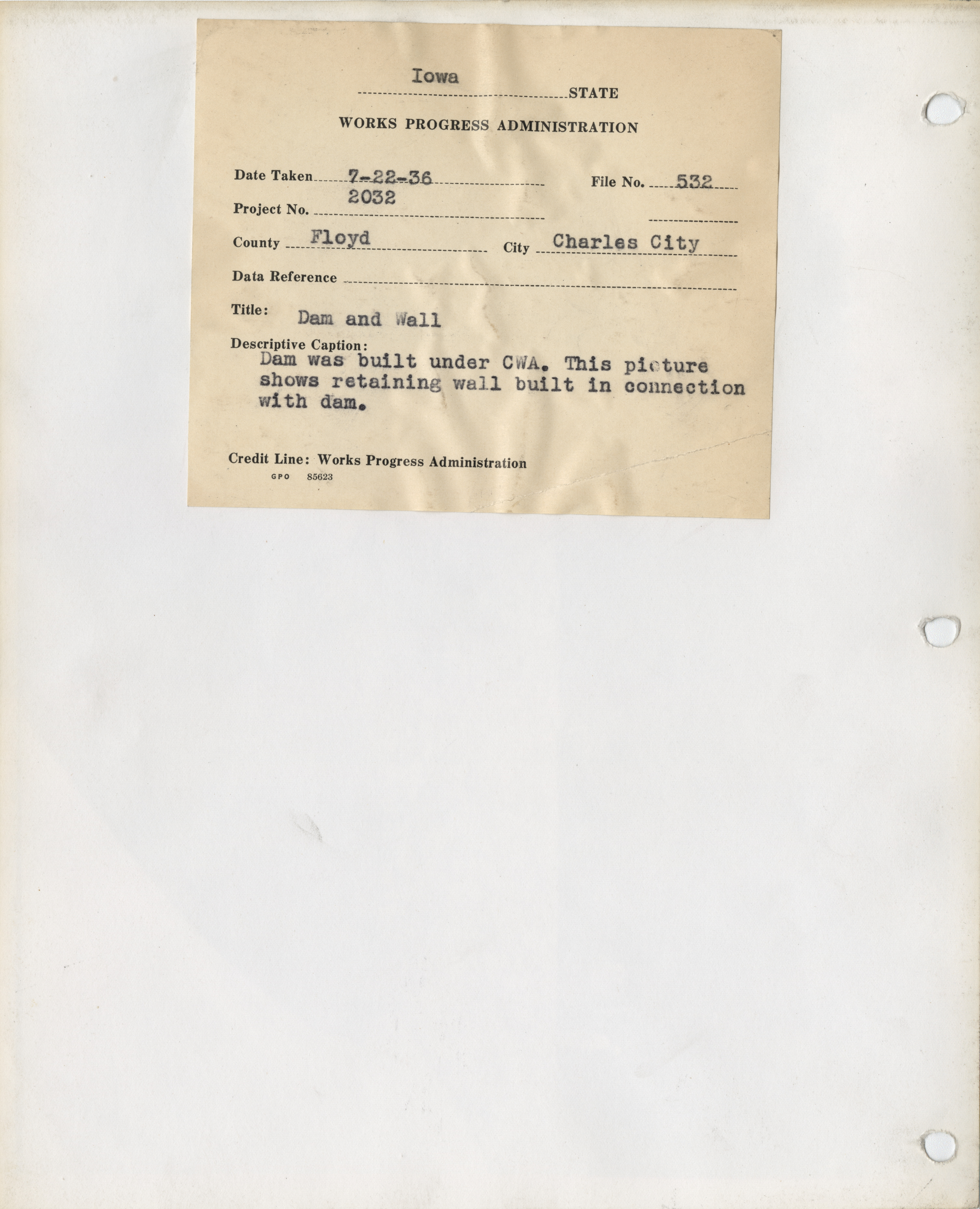 - District 1. Floyd County. Charles City. Dam and Wall. Project 2032. (1 b/w photograph), 1936
