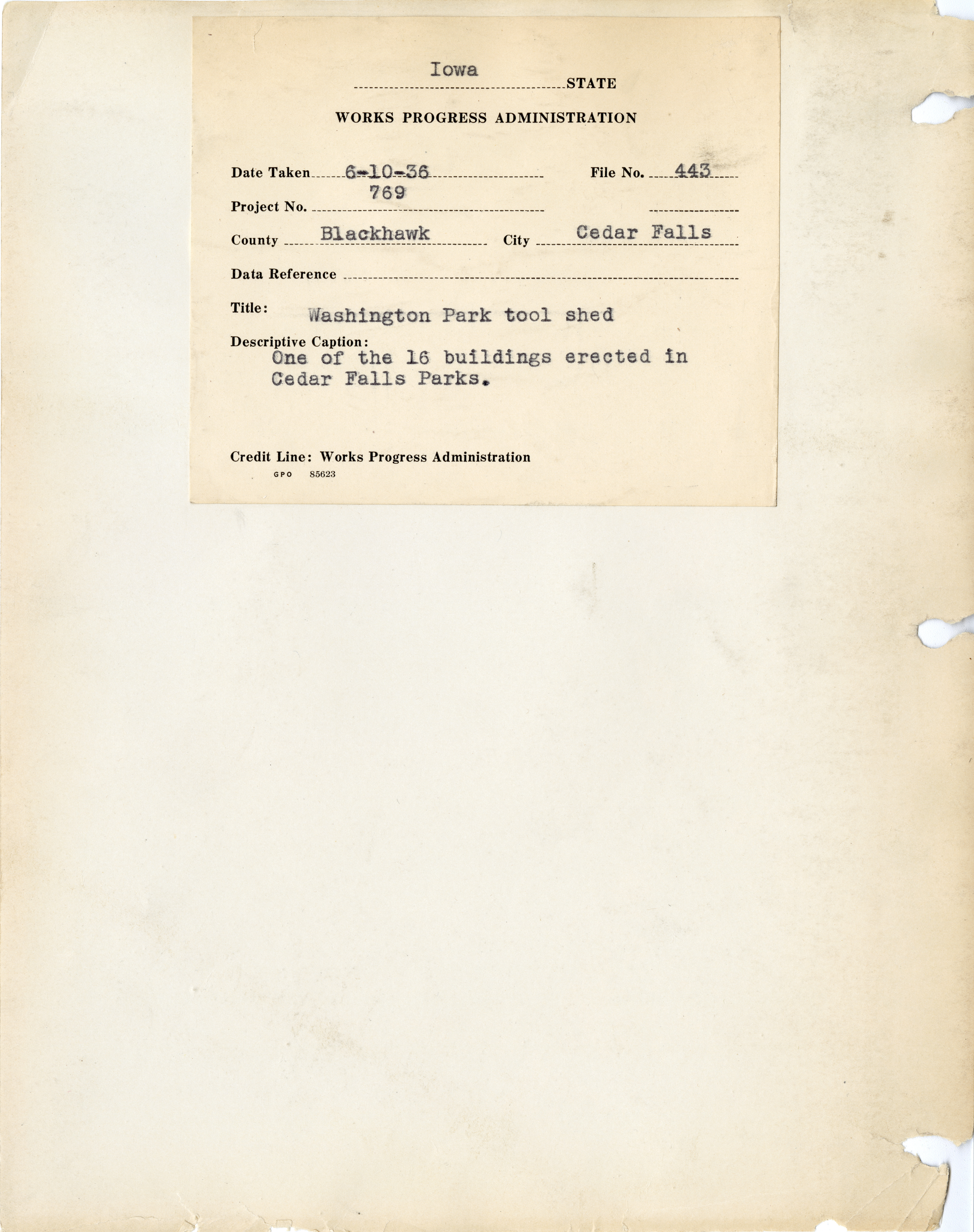 - "Photograph of a tool shed in Washington Park", Work Projects Administration (Iowa) Photographs, Iowa State University Library Digital Collections