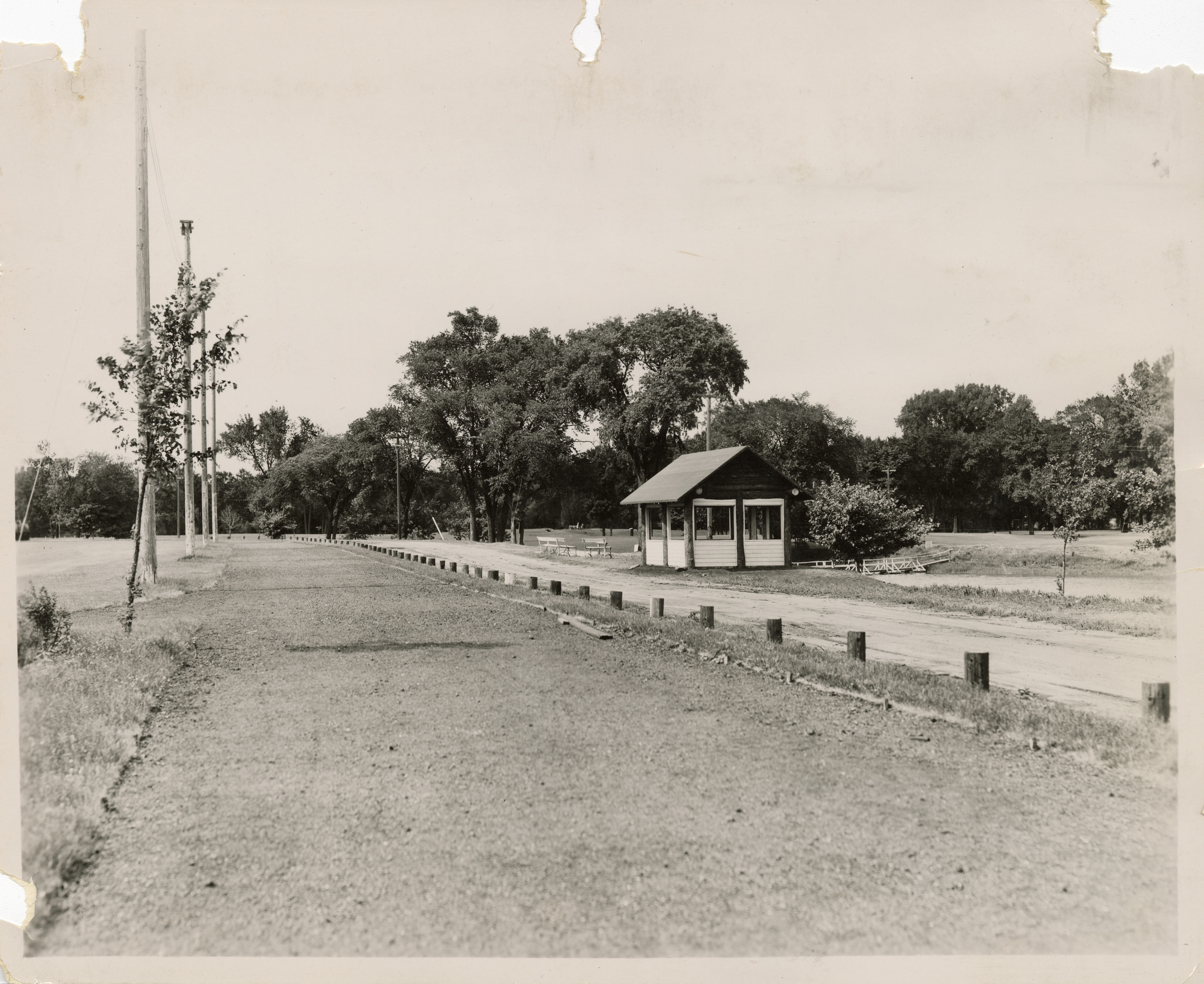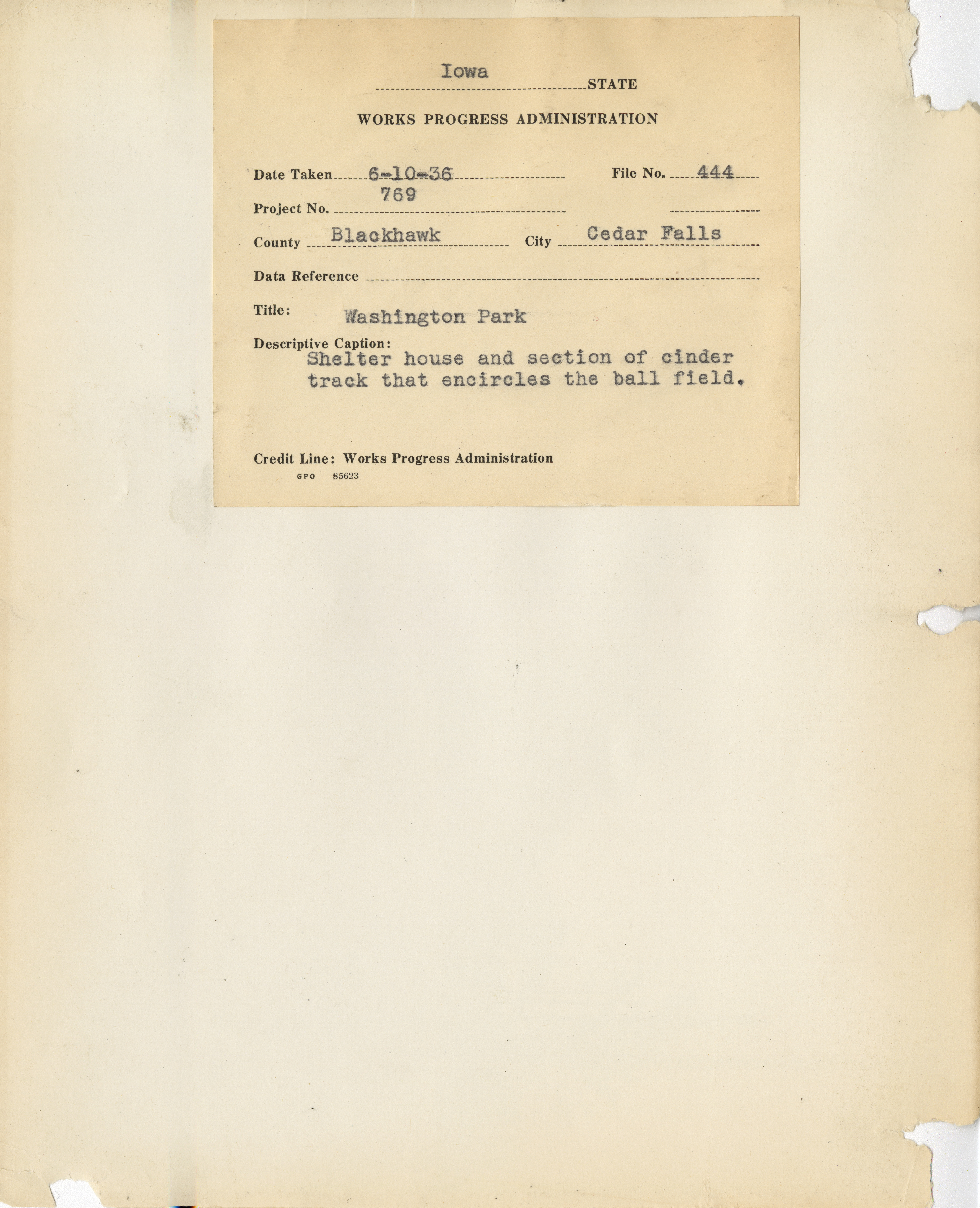 - "Photograph of a shelter house and a section of cinder track that encircles the ball field in Washington Park", Work Projects Administration (Iowa) Photographs, Iowa State University Library Digital Collections