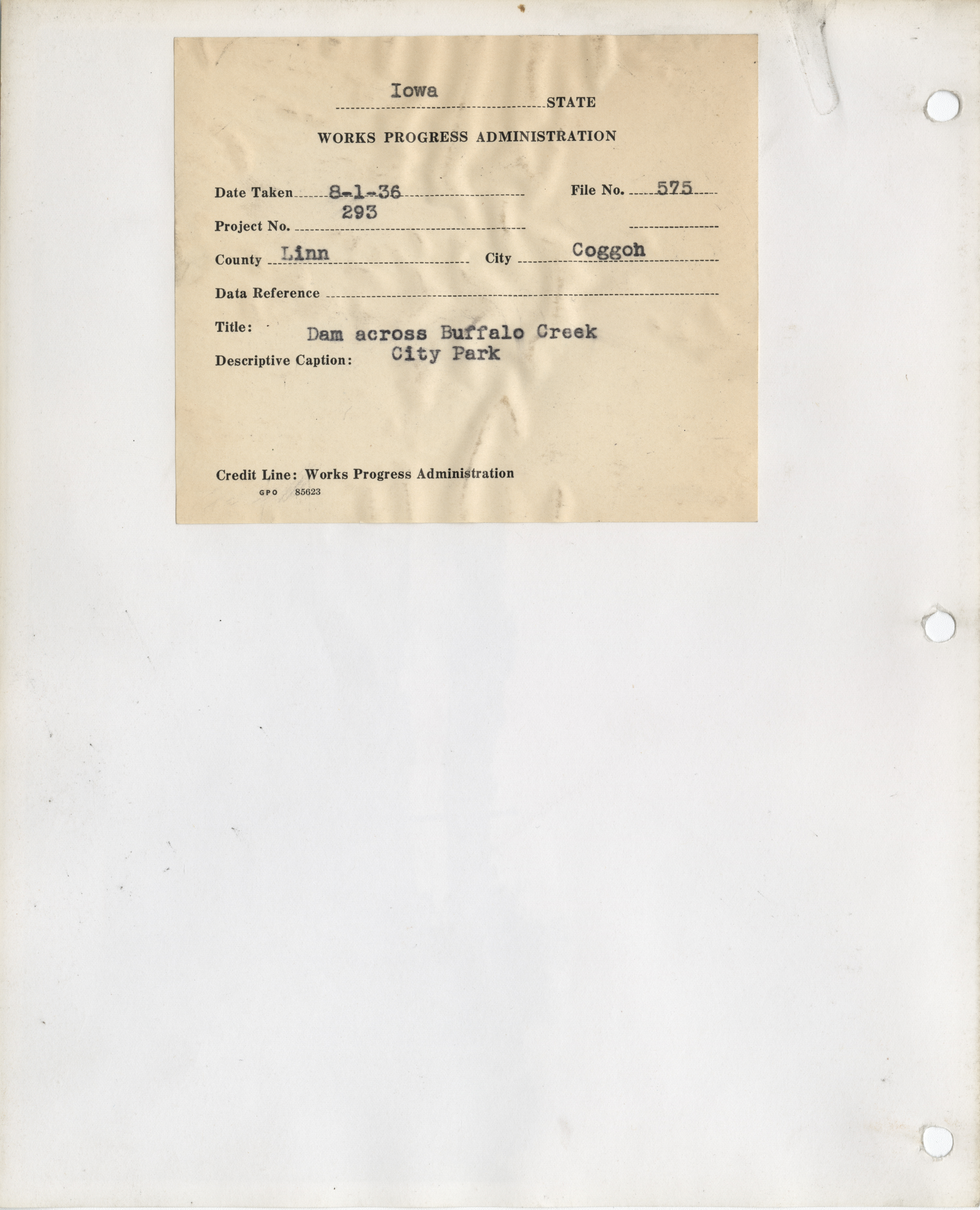 - "Photograph of a dam across Buffalo Creek in Coggon", Work Projects Administration (Iowa) Photographs, Iowa State University Library Digital Collections