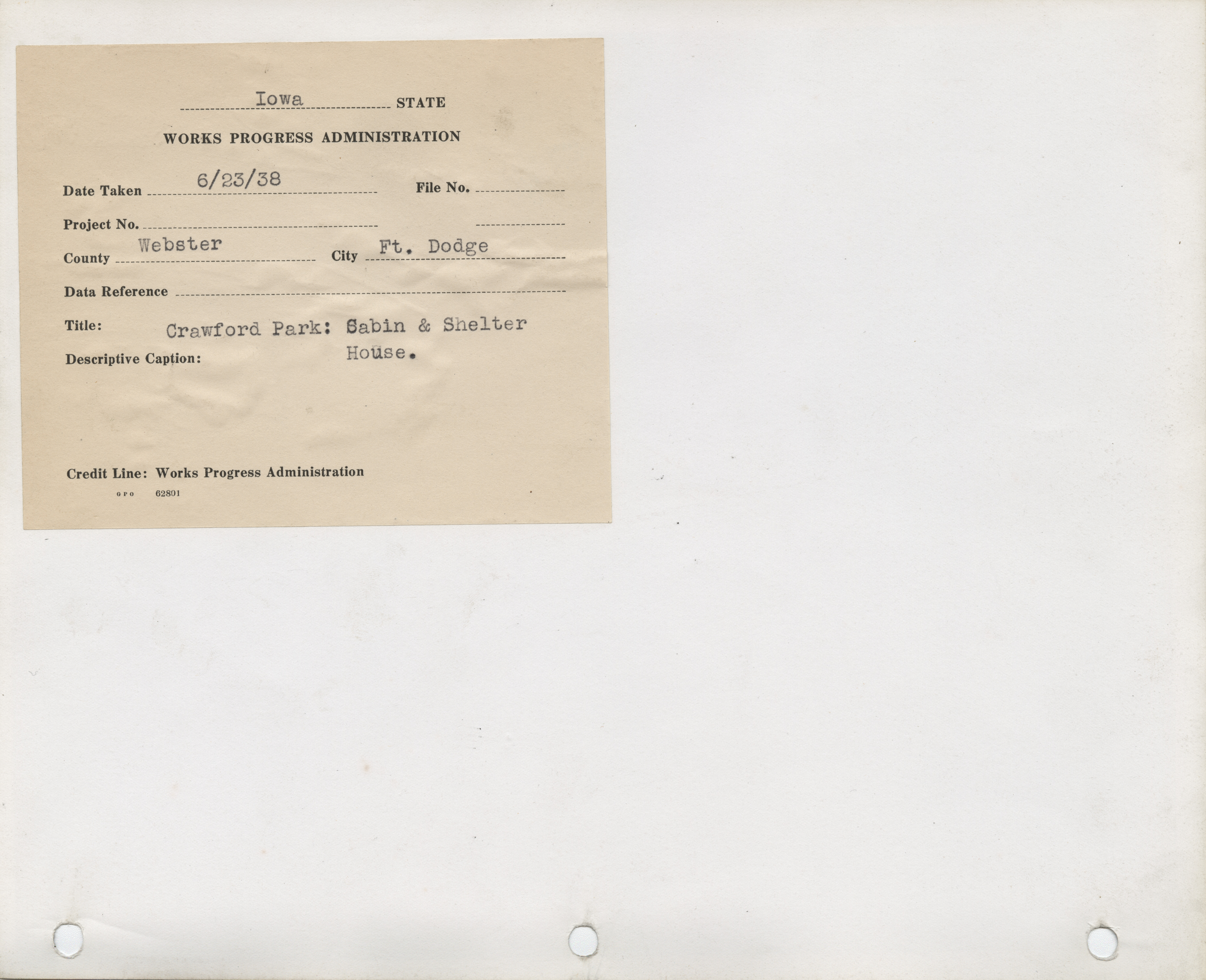 - "Photograph of the cabin at Crawford Park in Fort Dodge", Work Projects Administration (Iowa) Photographs, Iowa State University Library Digital Collections