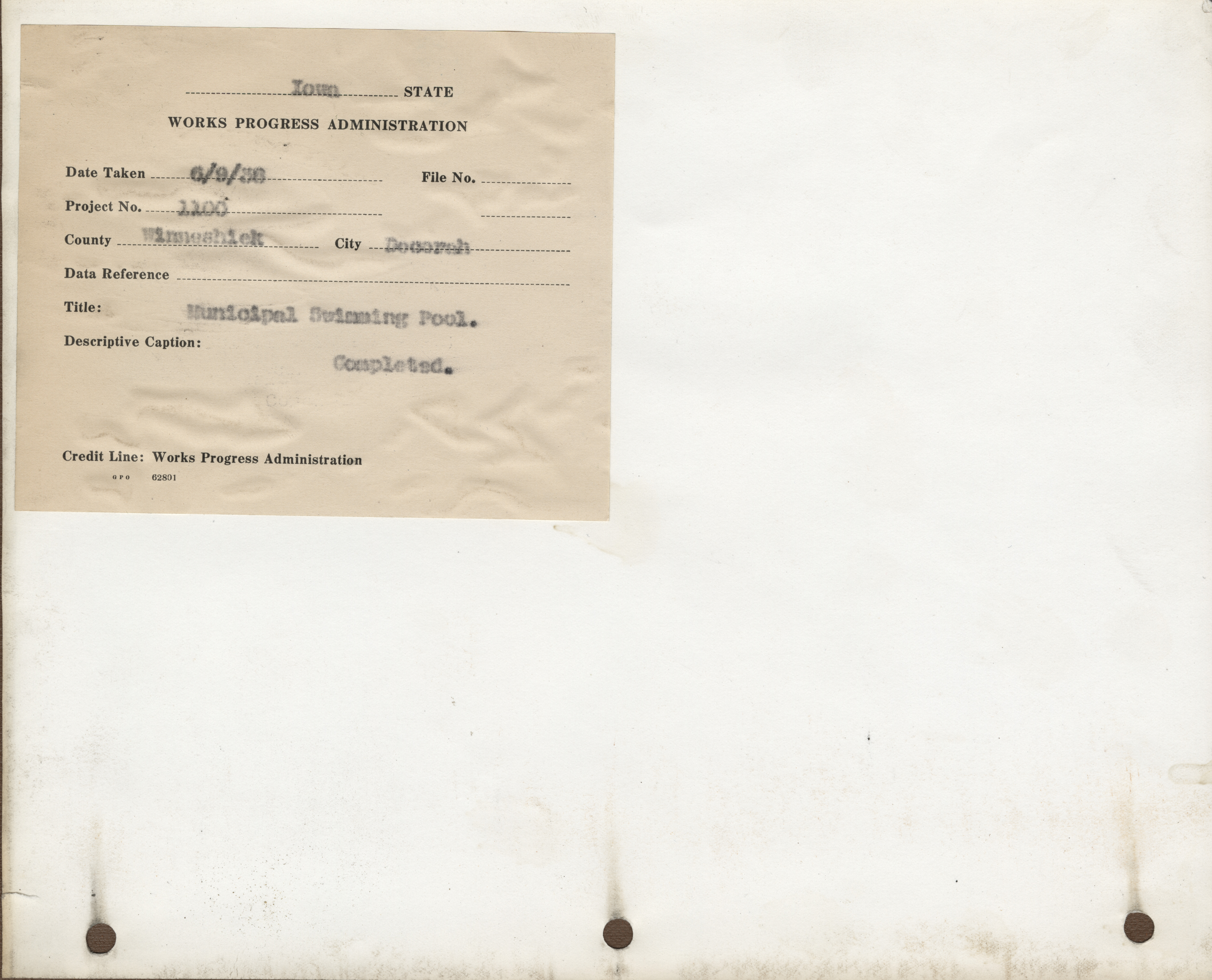 - District 1. Winnebago County. Decorah. Swimming Pool. Project 1100. (3 b/w photographs), 1938