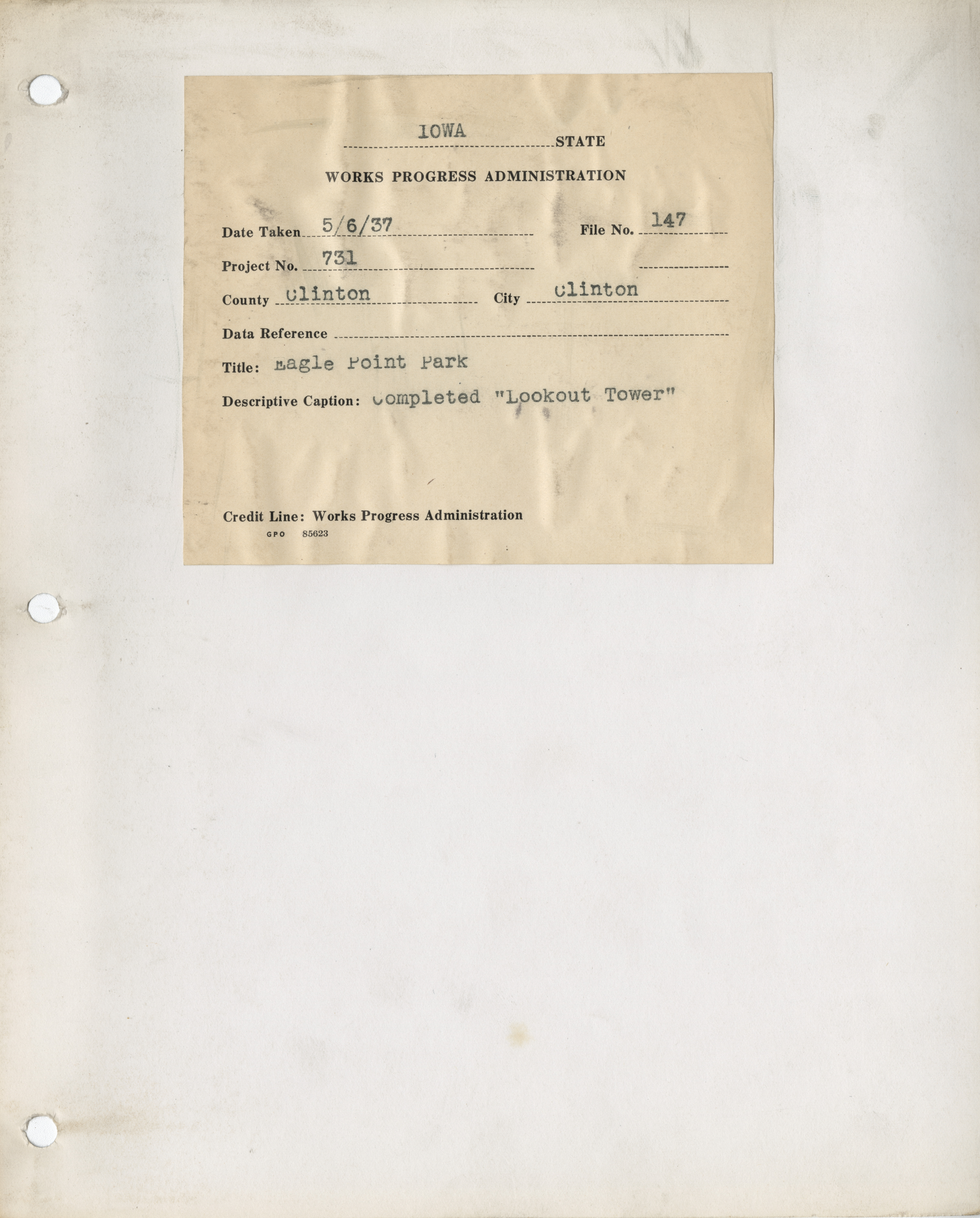 - "Photograph looking up at the completed lookout tower at Eagle Point Park in Clinton", Work Projects Administration (Iowa) Photographs, Iowa State University Library Digital Collections