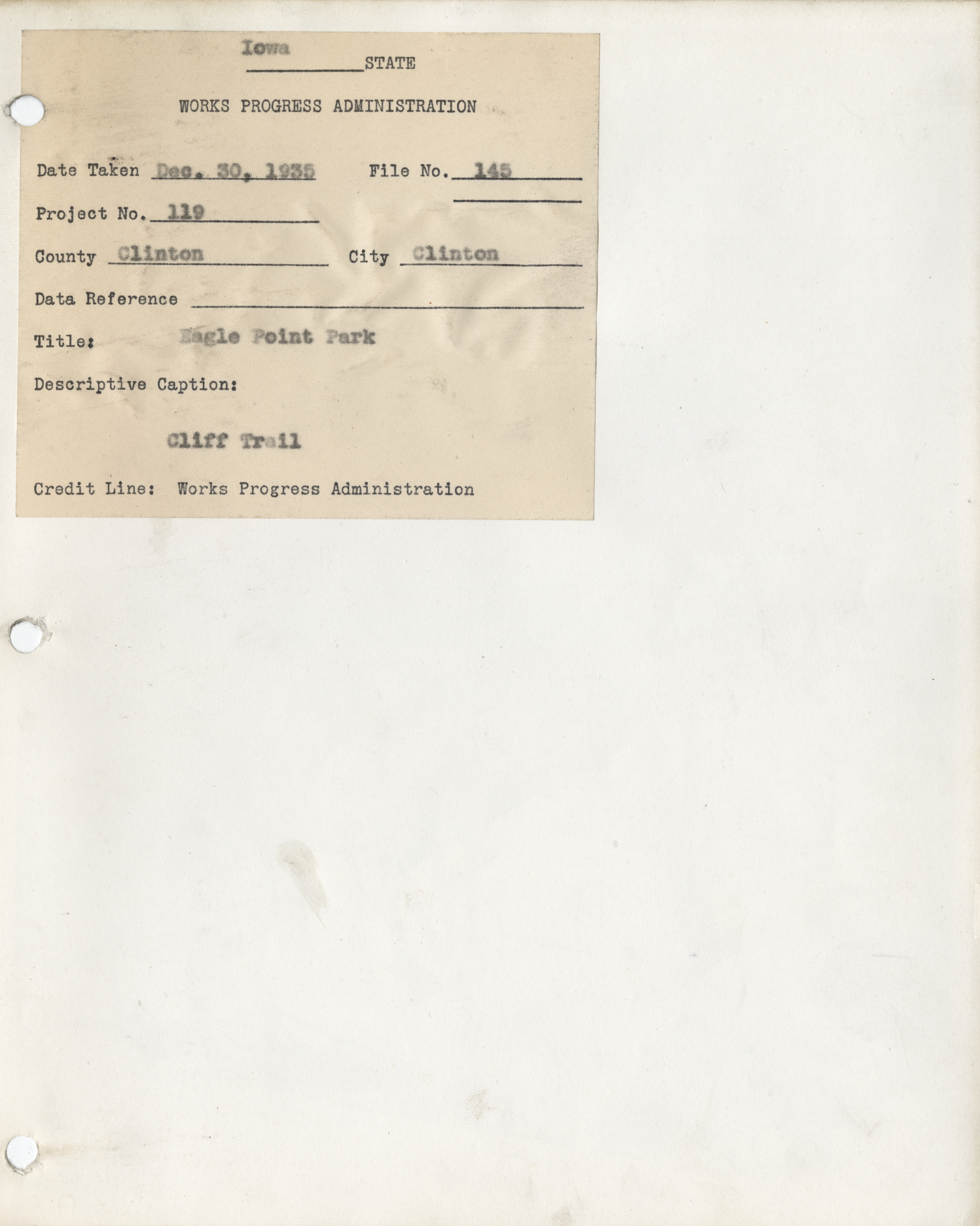 - "Photograph of the cliff trail at Eagle Point Park in Clinton", Work Projects Administration (Iowa) Photographs, Iowa State University Library Digital Collections