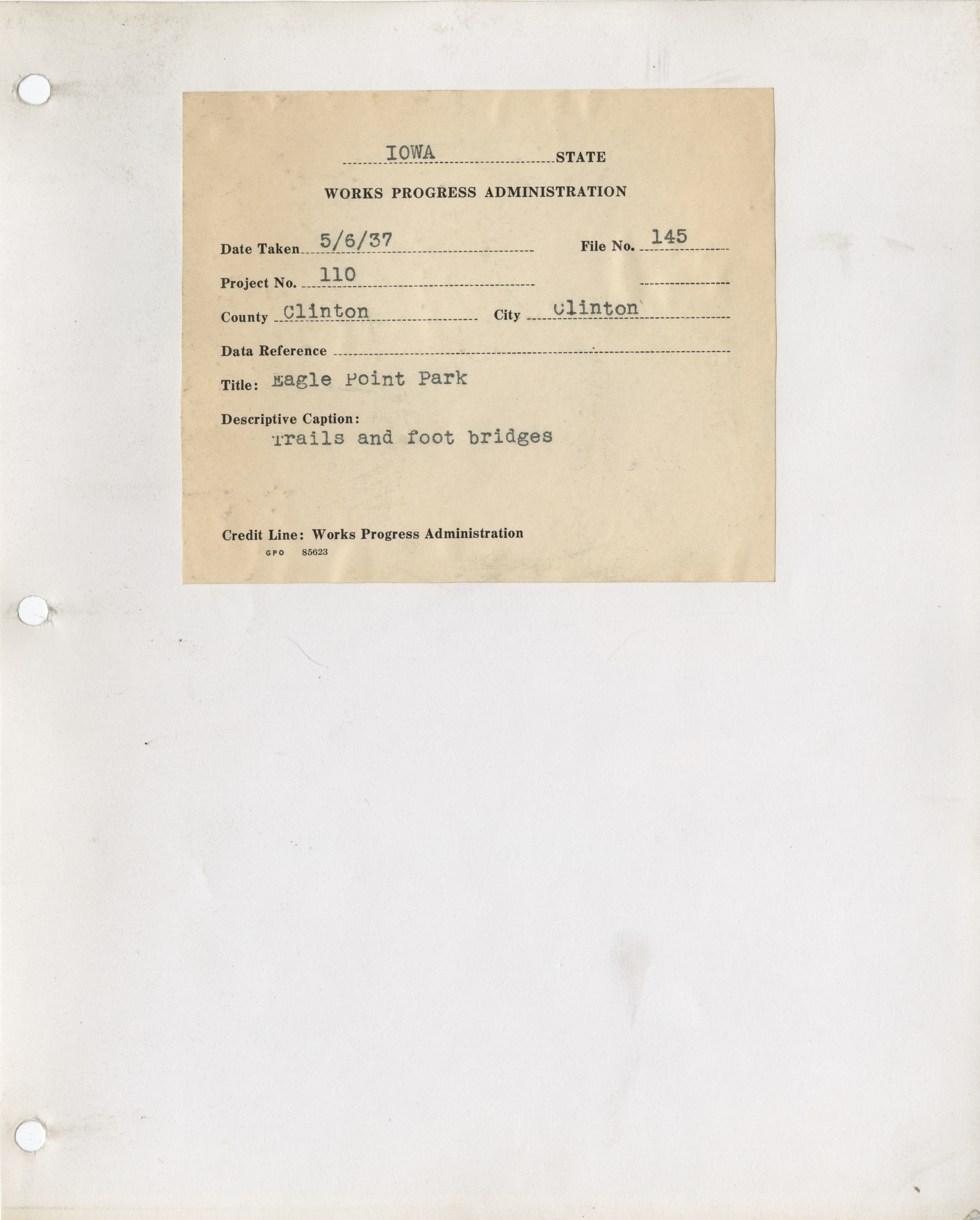 - "Photograph of footbridge and trails at Eagle Point Park in Clinton", Work Projects Administration (Iowa) Photographs, Iowa State University Library Digital Collections