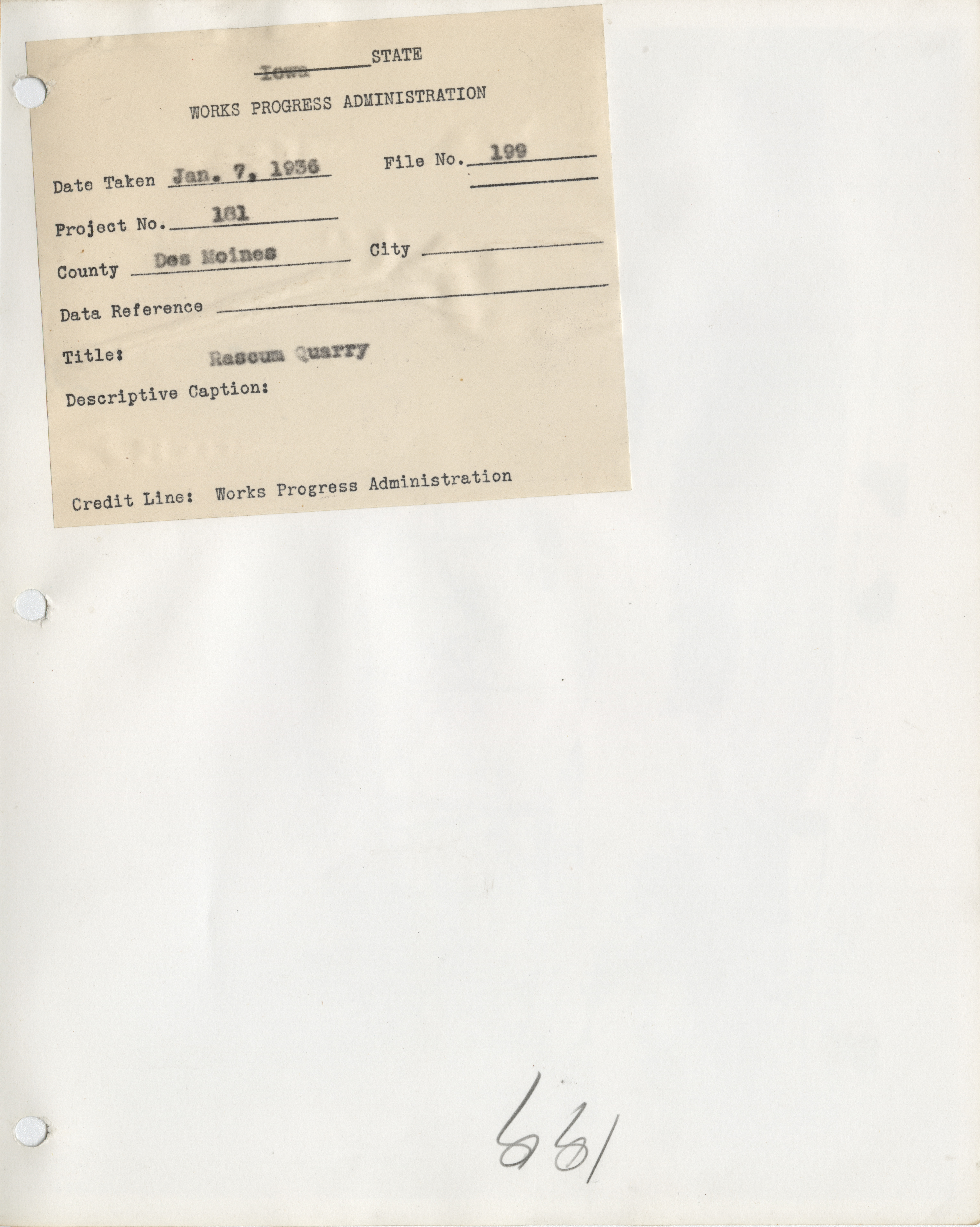 - District 2. Des Moines County. Rascum Quarry. Project 181. (2 b/w photographs), 1936