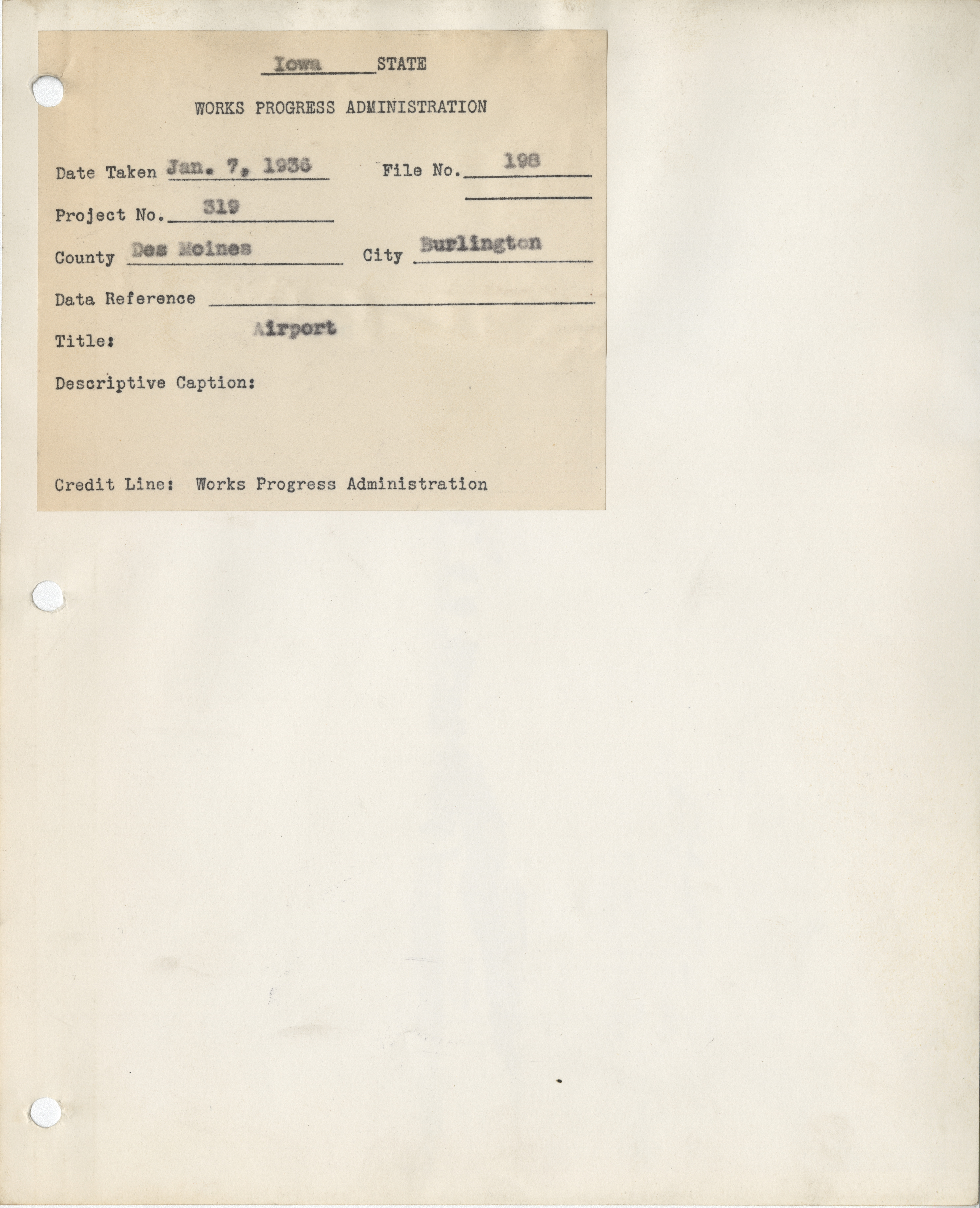 - District 2. Des Moines County. Burlington. Airport. Project 319. (1 b/w photograph), 1936