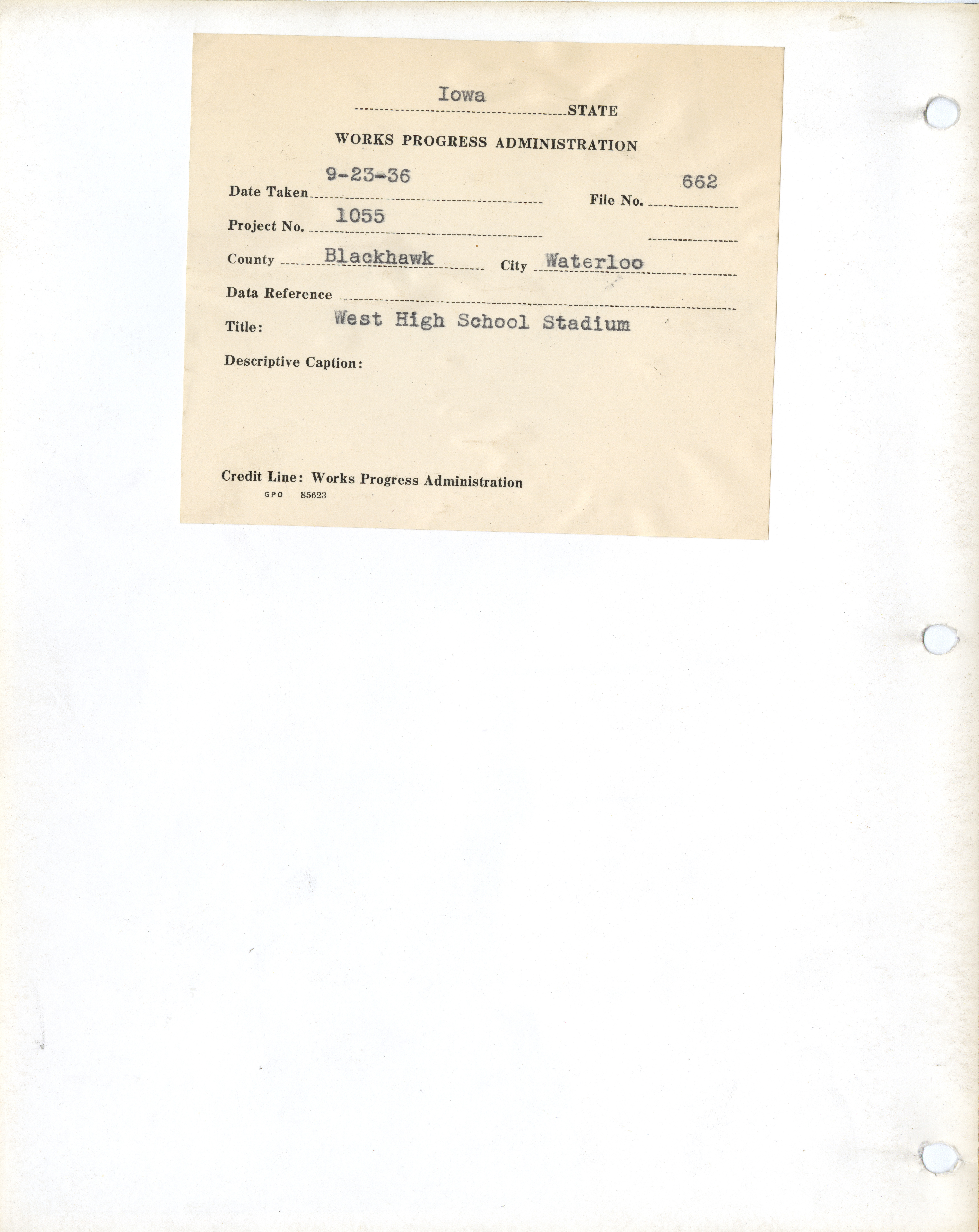 - District 1. Blackhawk County. Waterloo. West High School Stadium. Project 1055. (1 b/w photograph), 1936