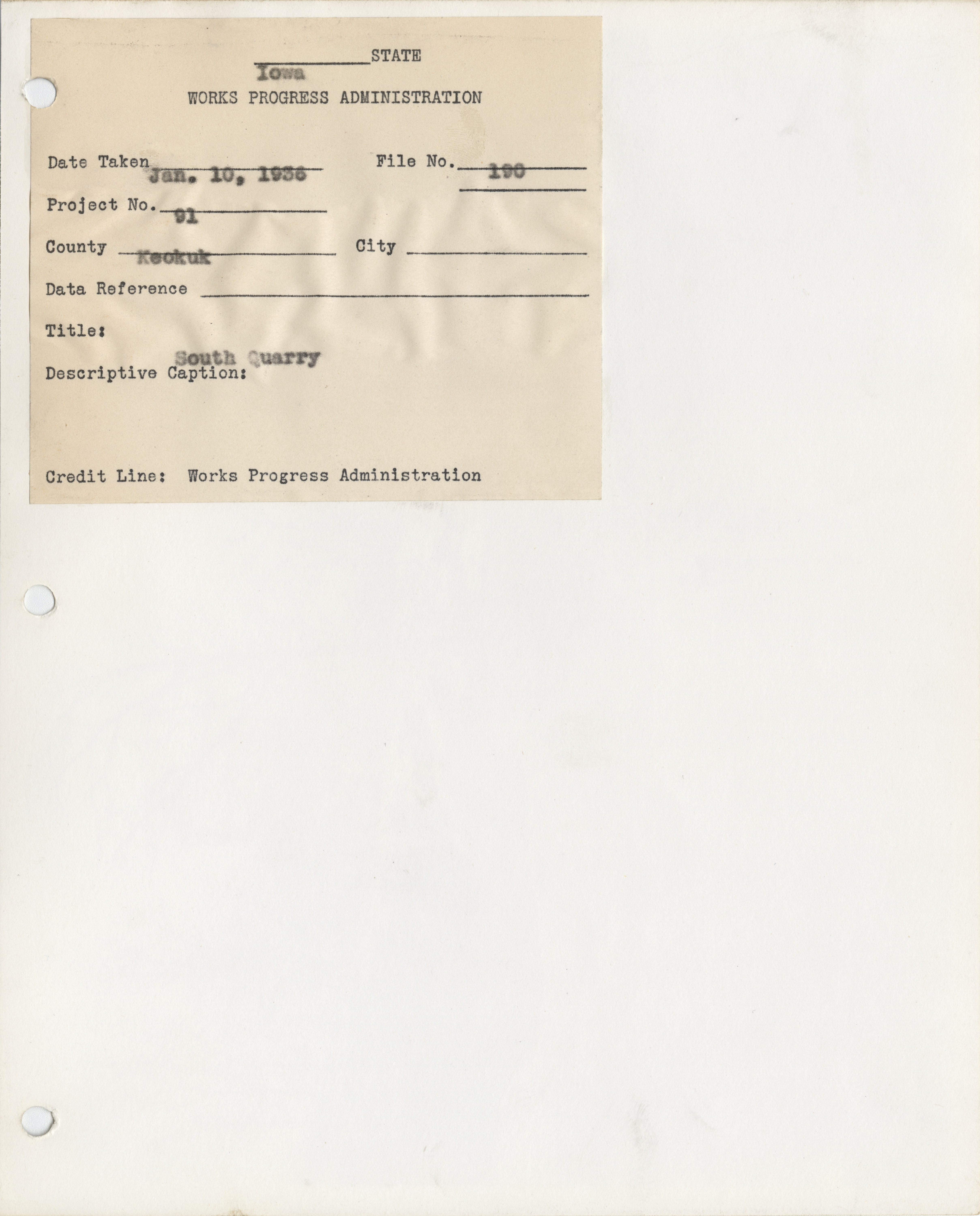 - "Photograph of South Quarry in Keokuk County", Work Projects Administration (Iowa) Photographs, Iowa State University Library Digital Collections