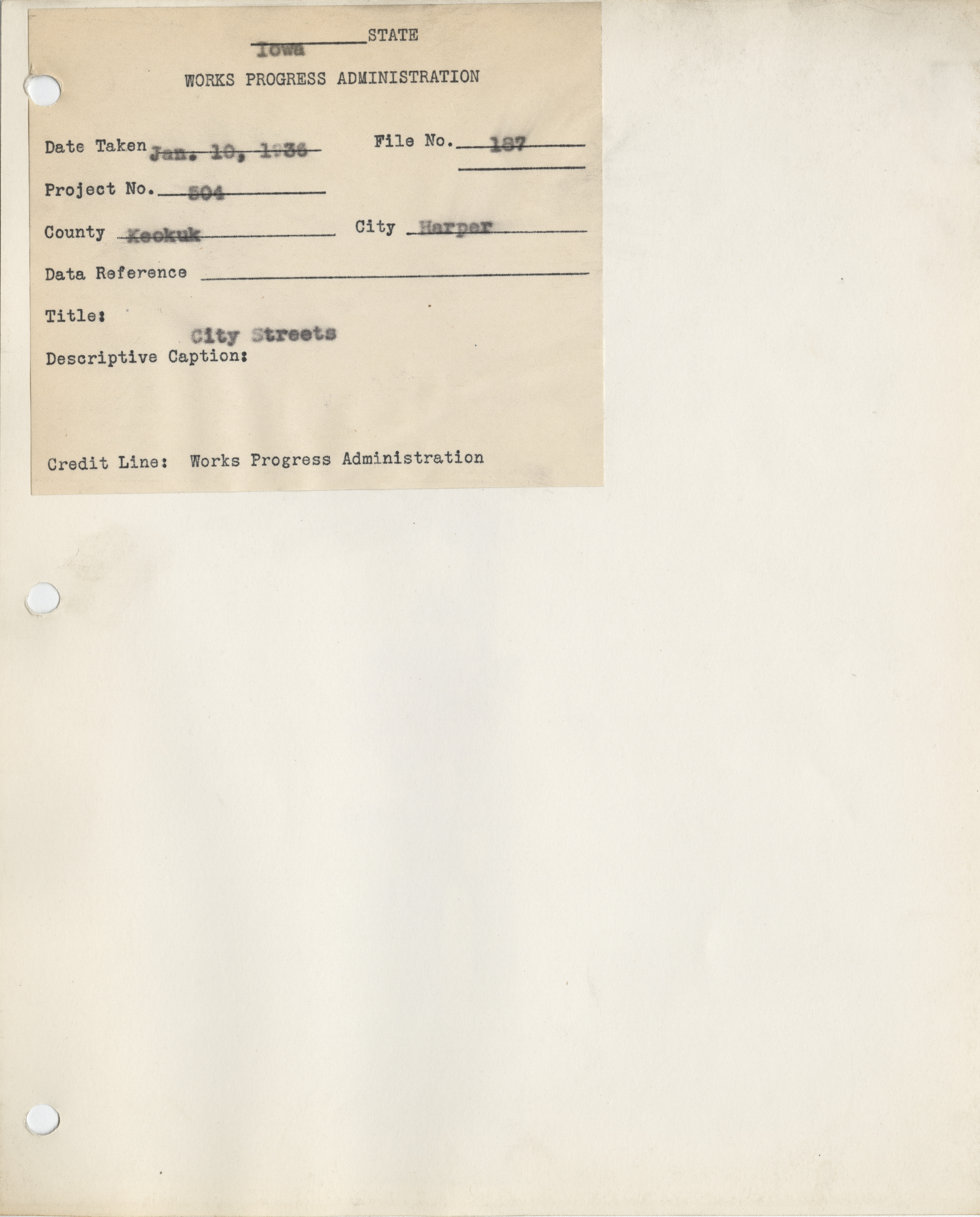 - District 2. Keokuk County. Harper. City Streets. Project 504. (1 b/w photograph), 1936