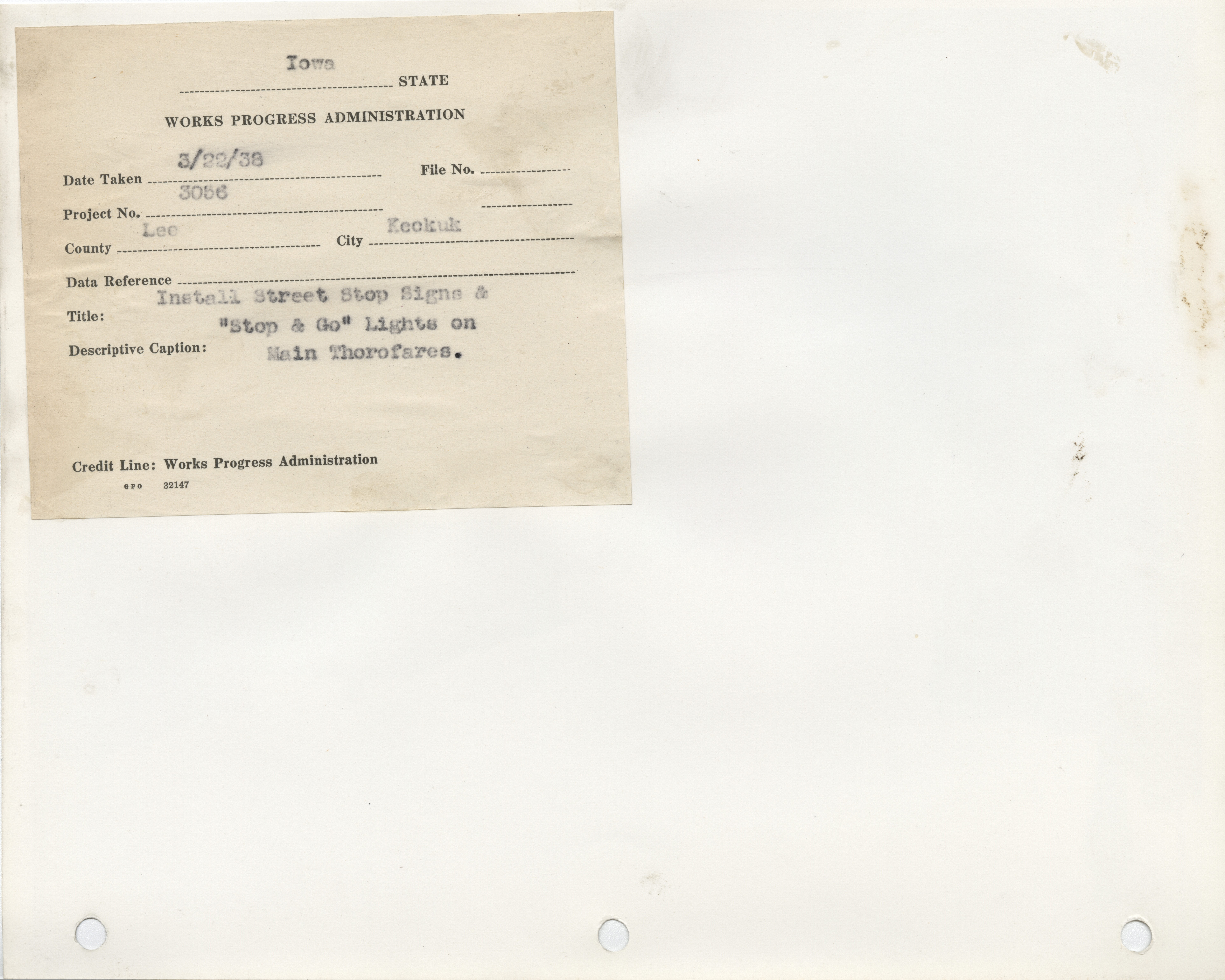 - District 2. Lee County. Keokuk. Stop Signs and Stop Lights. Project 3056. (1 b/w photograph), 1938