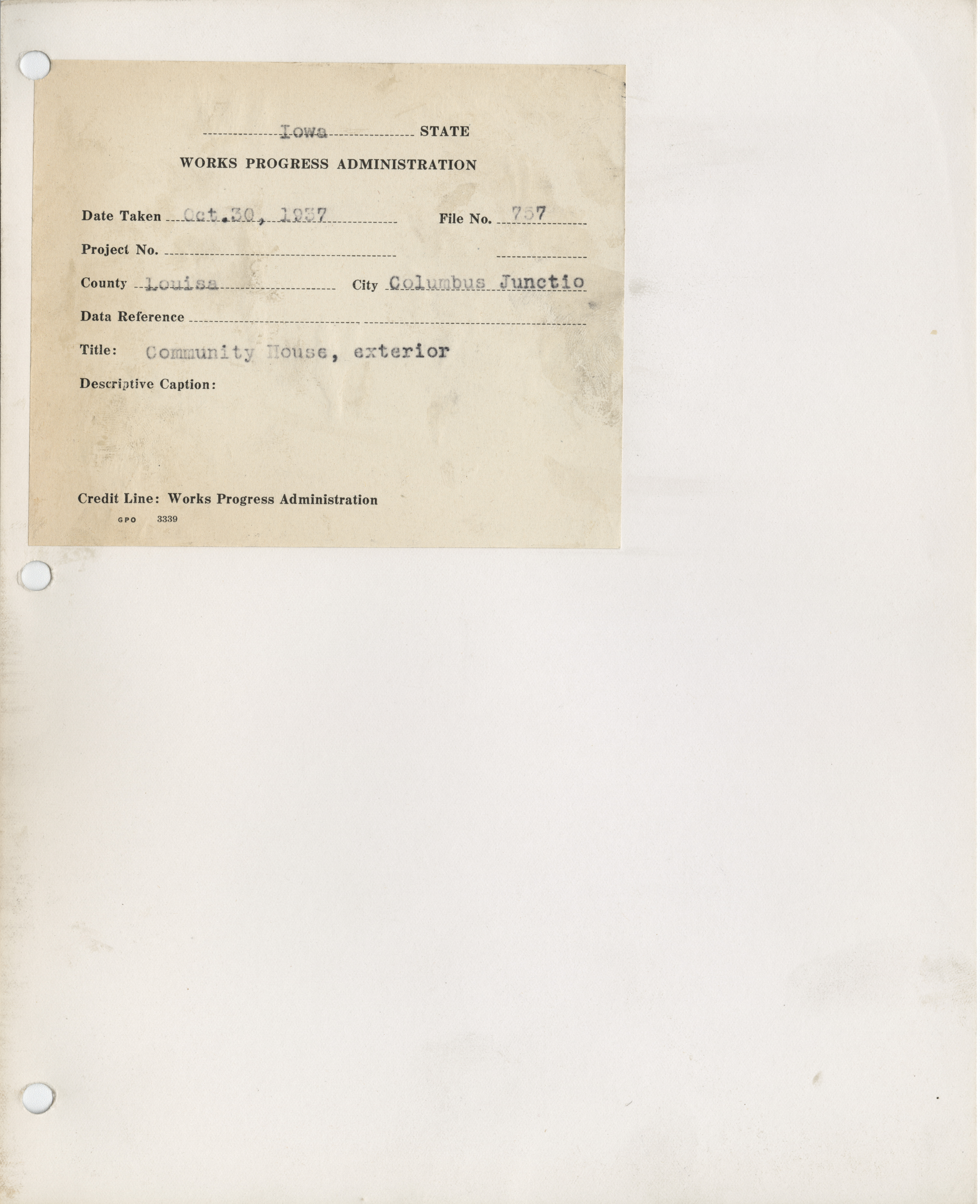 - "Photograph of a car parked outside the community house in Columbus Junction", Work Projects Administration (Iowa) Photographs, Iowa State University Library Digital Collections
