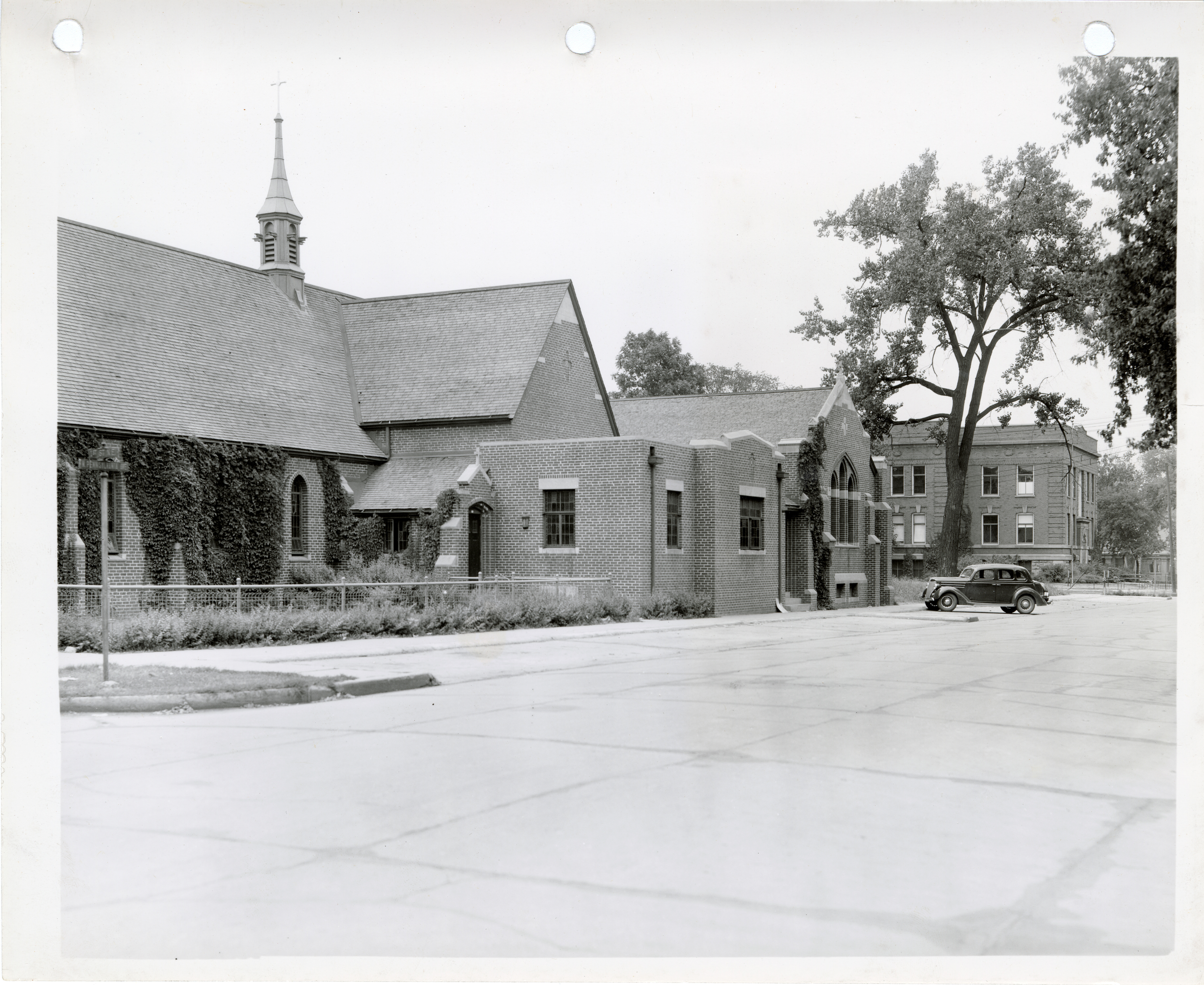 Photograph of buildings and a car parked in the parking area of the Mason City business district Item Info