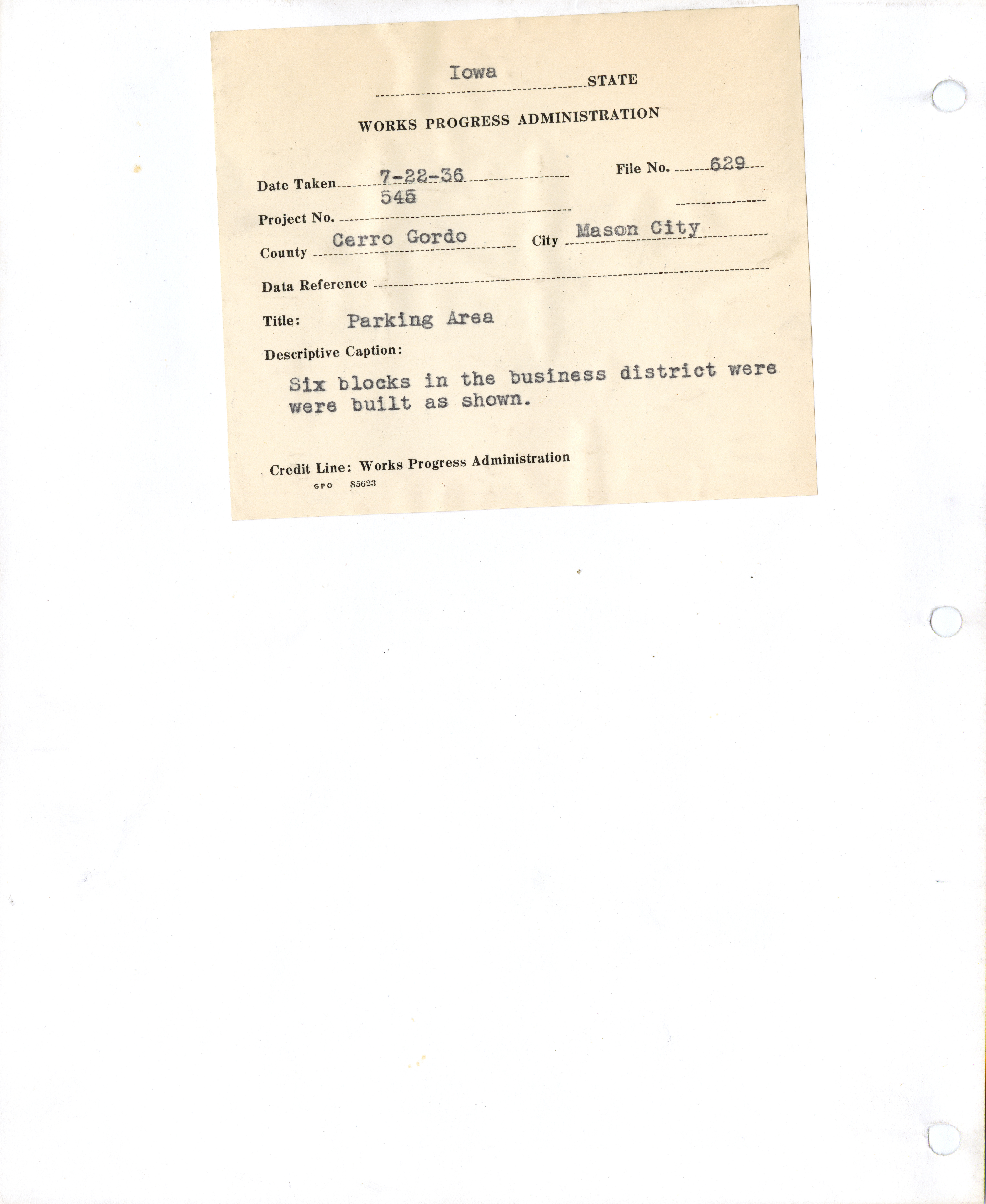 - District 1. Cerro Gordo County. Mason City. Parking Area. Project 545. (1 b/w photograph), 1936