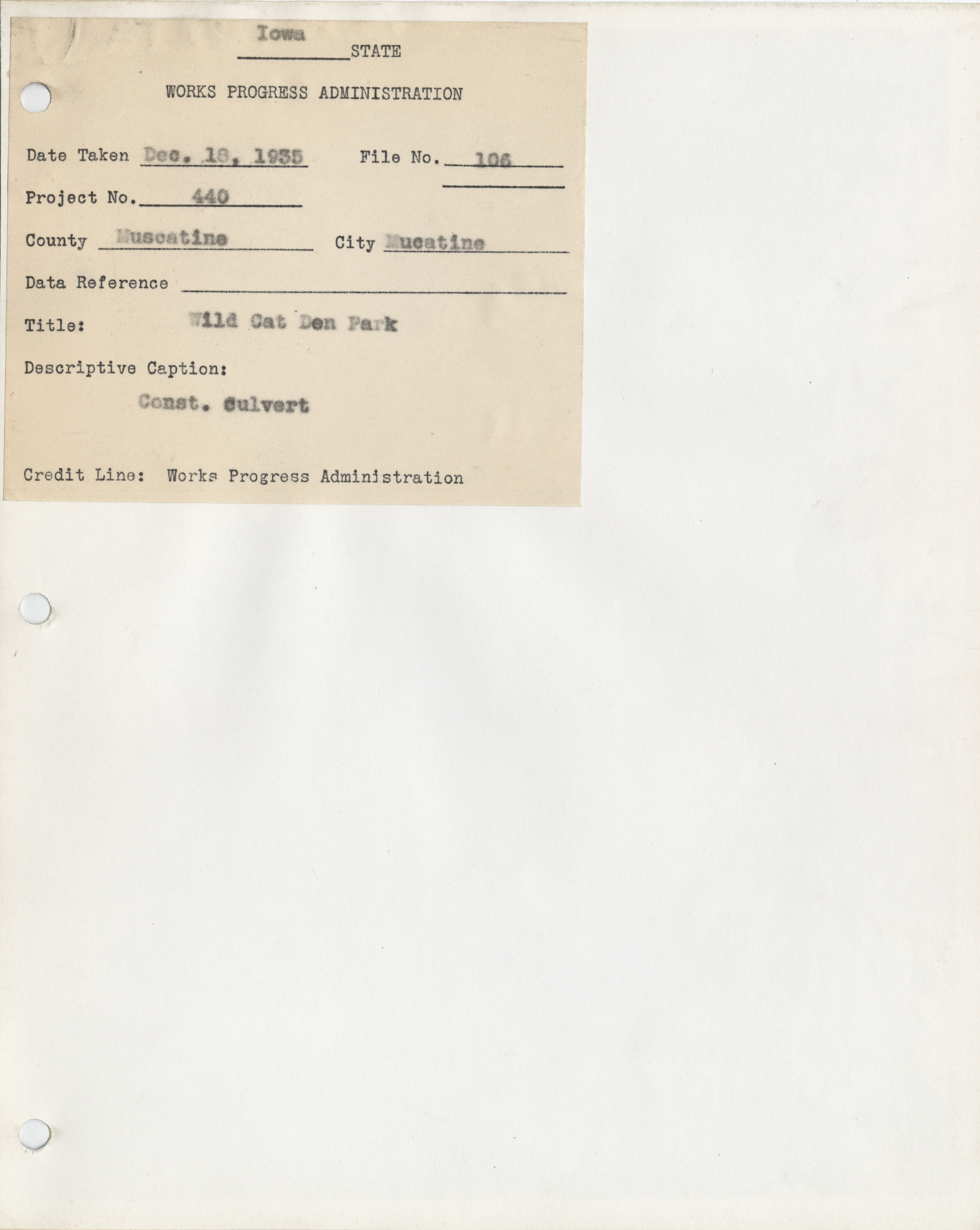- District 2. Muscatine County. Muscatine. Wild Cat Den Park Culvert. Project 440. (1 b/w photograph), 1935