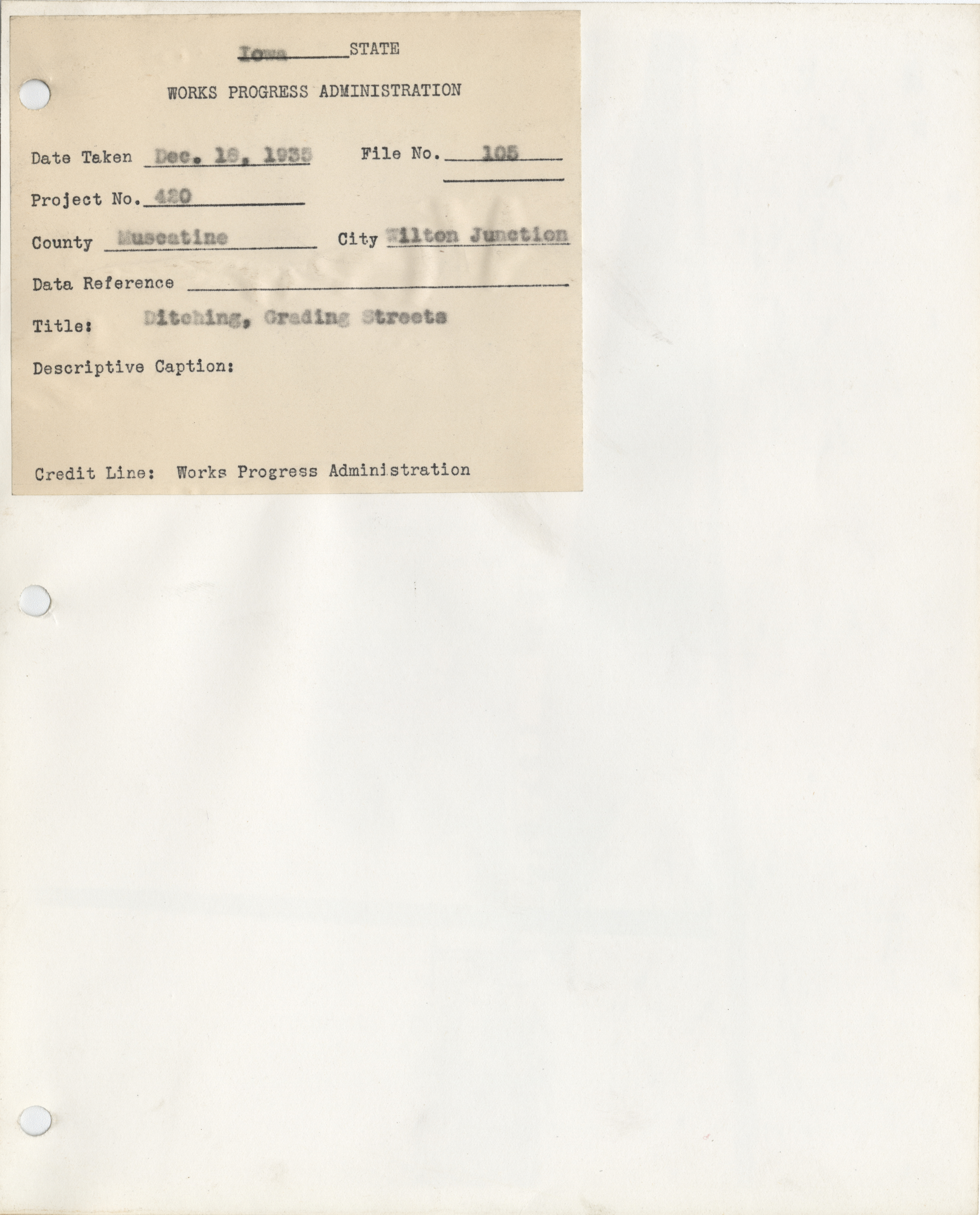 - District 2. Muscatine County. Wilton Junction. Ditching and Grading Streets. Project 420. (1 b/w photograph), 1935