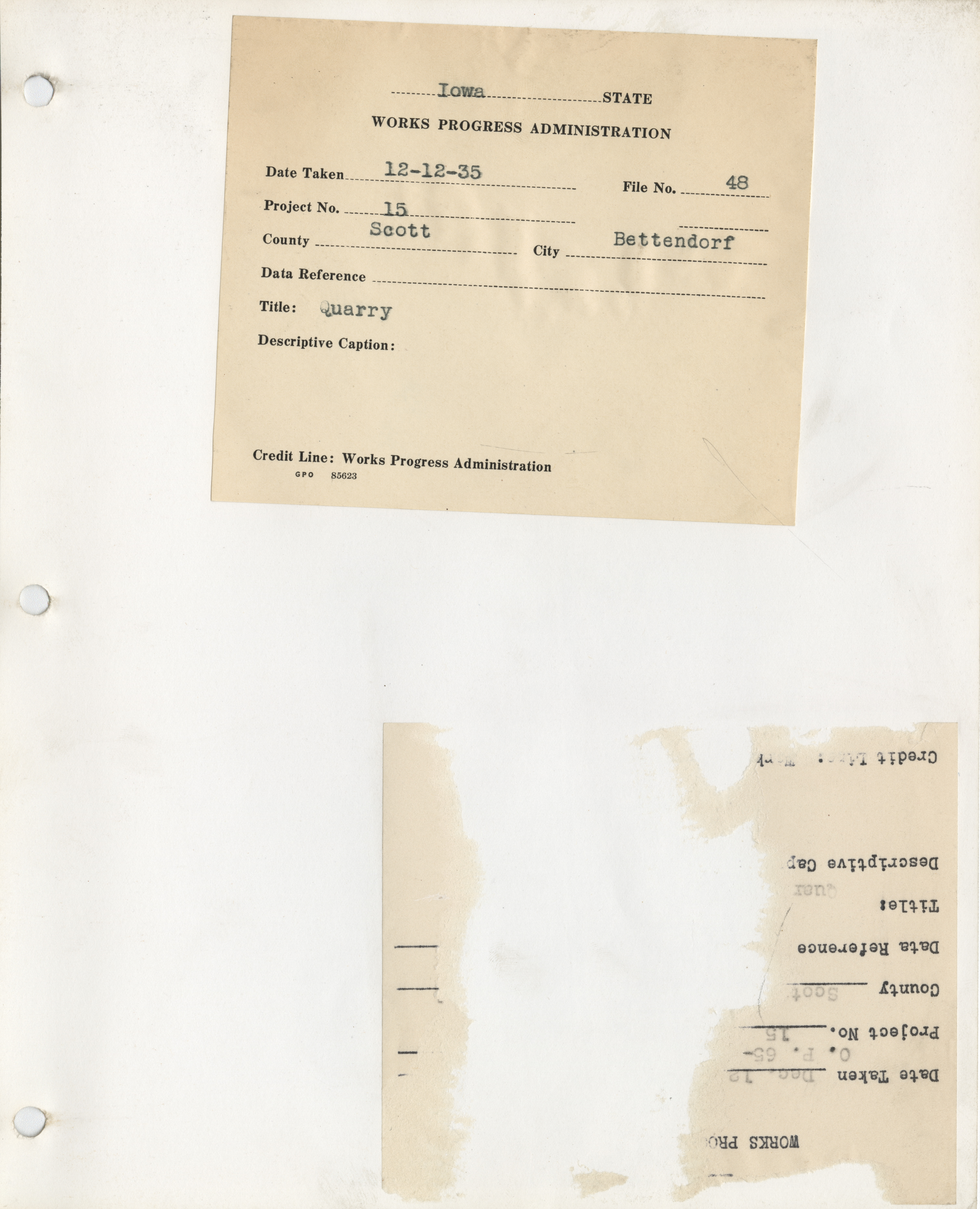 - District 2. Scott County. Bettendorf. Quarry. Project 15. (1 b/w photograph), 1935