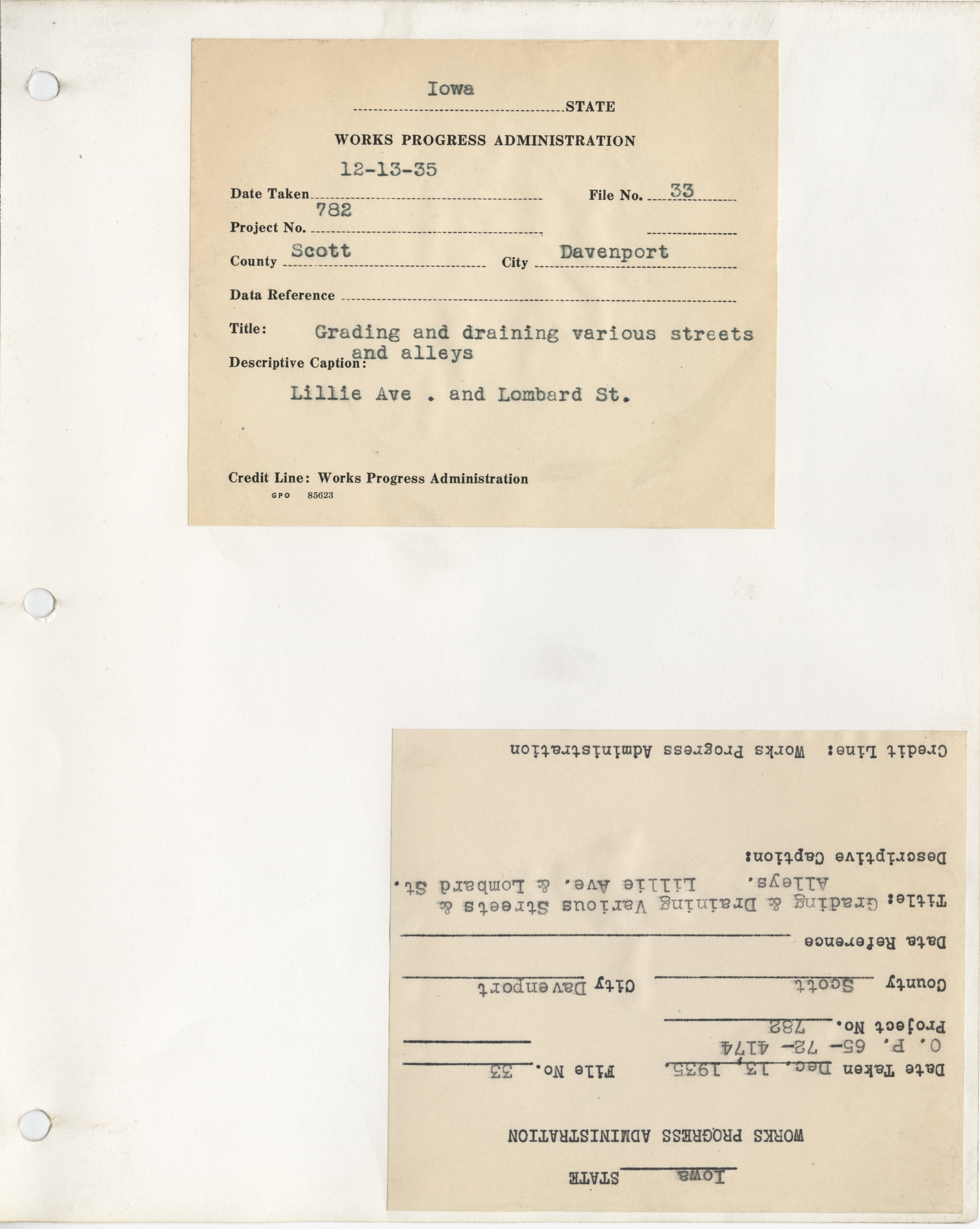 - District 2. Scott County. Davenport. Grading and Draining Lillie Avenue and Lombard Street. Project 782. (1 b/w photograph), 1935