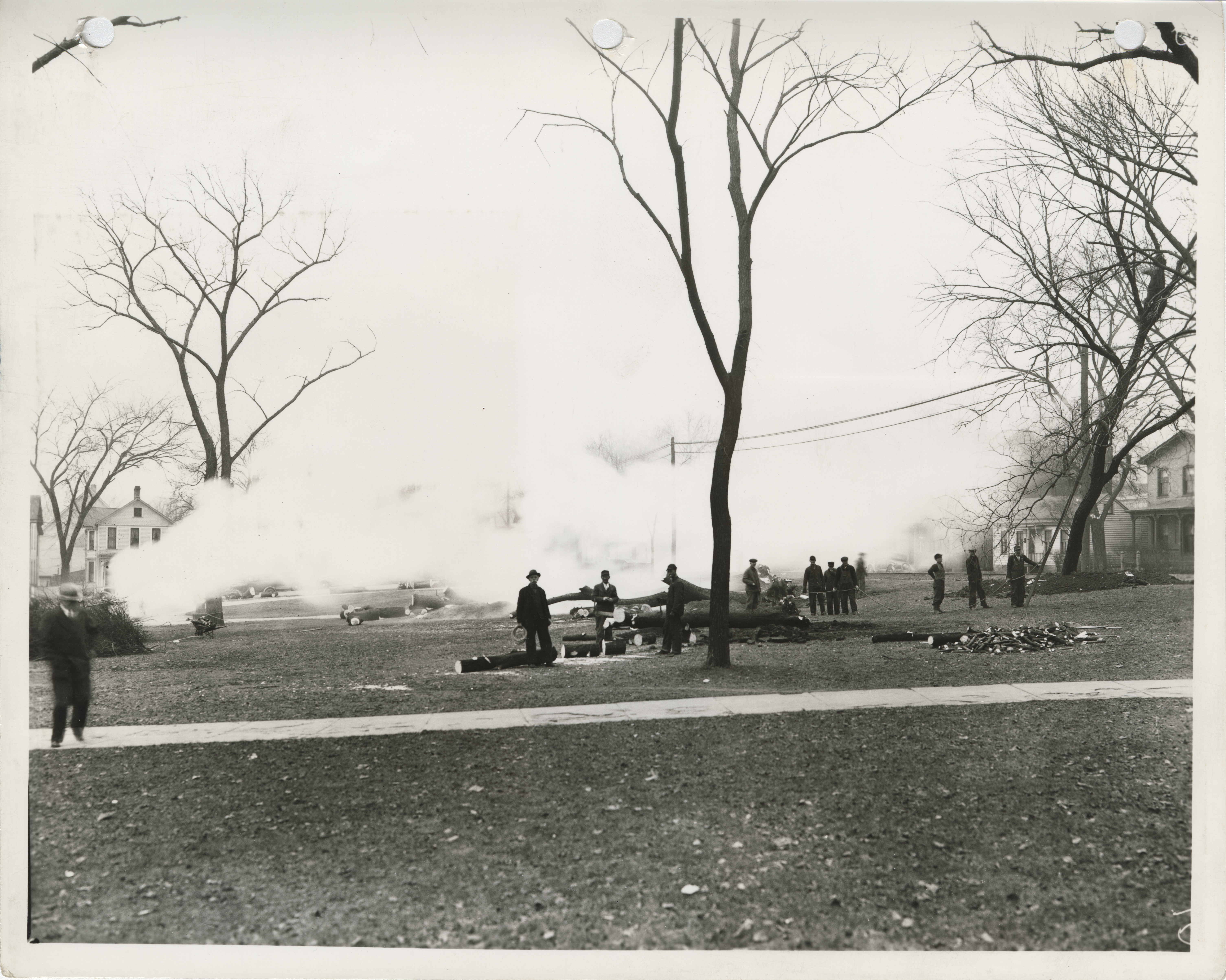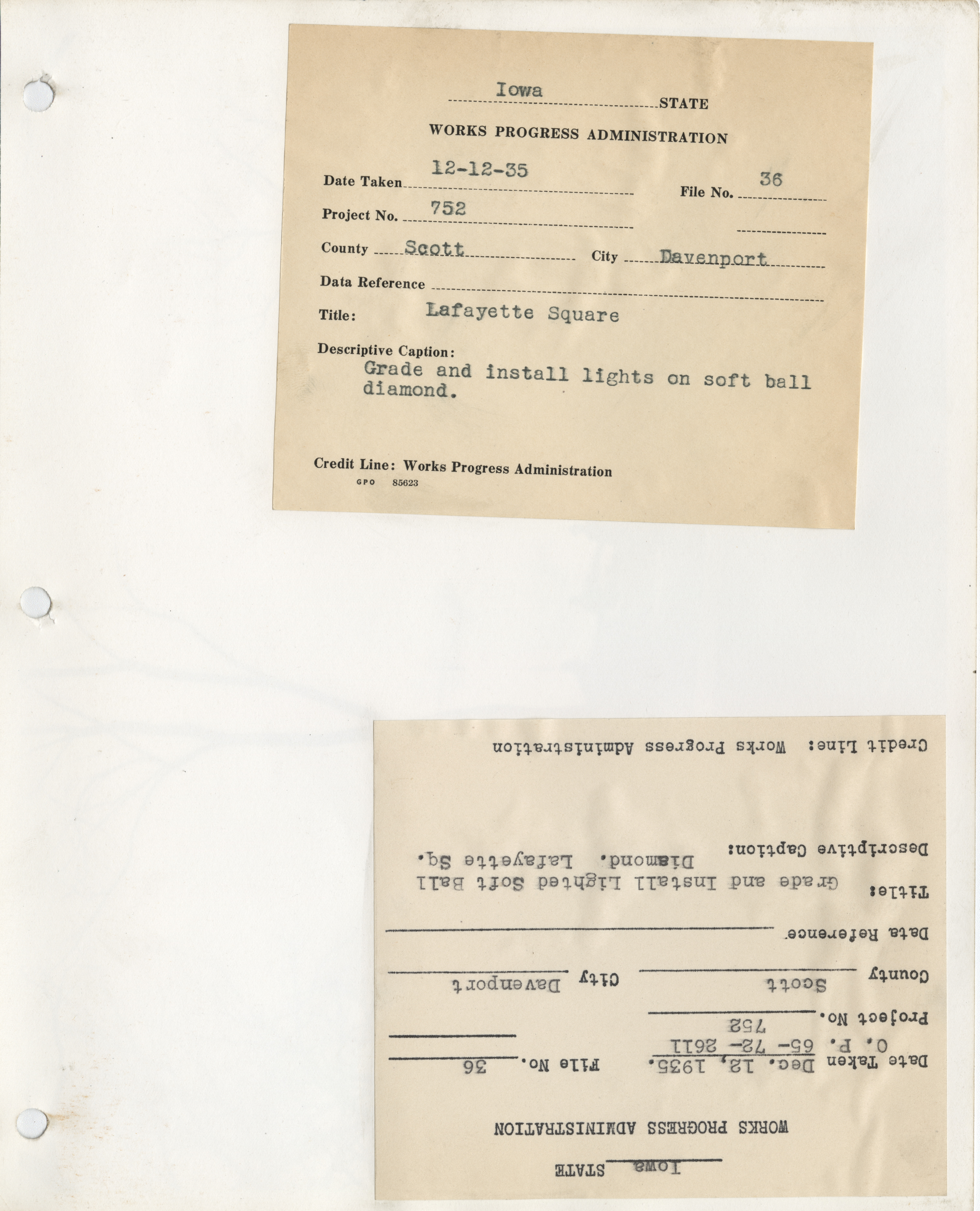 - "Photograph of people grading and installing lights for a softball diamond at Lafayette Square in Davenport", Work Projects Administration (Iowa) Photographs, Iowa State University Library Digital Collections