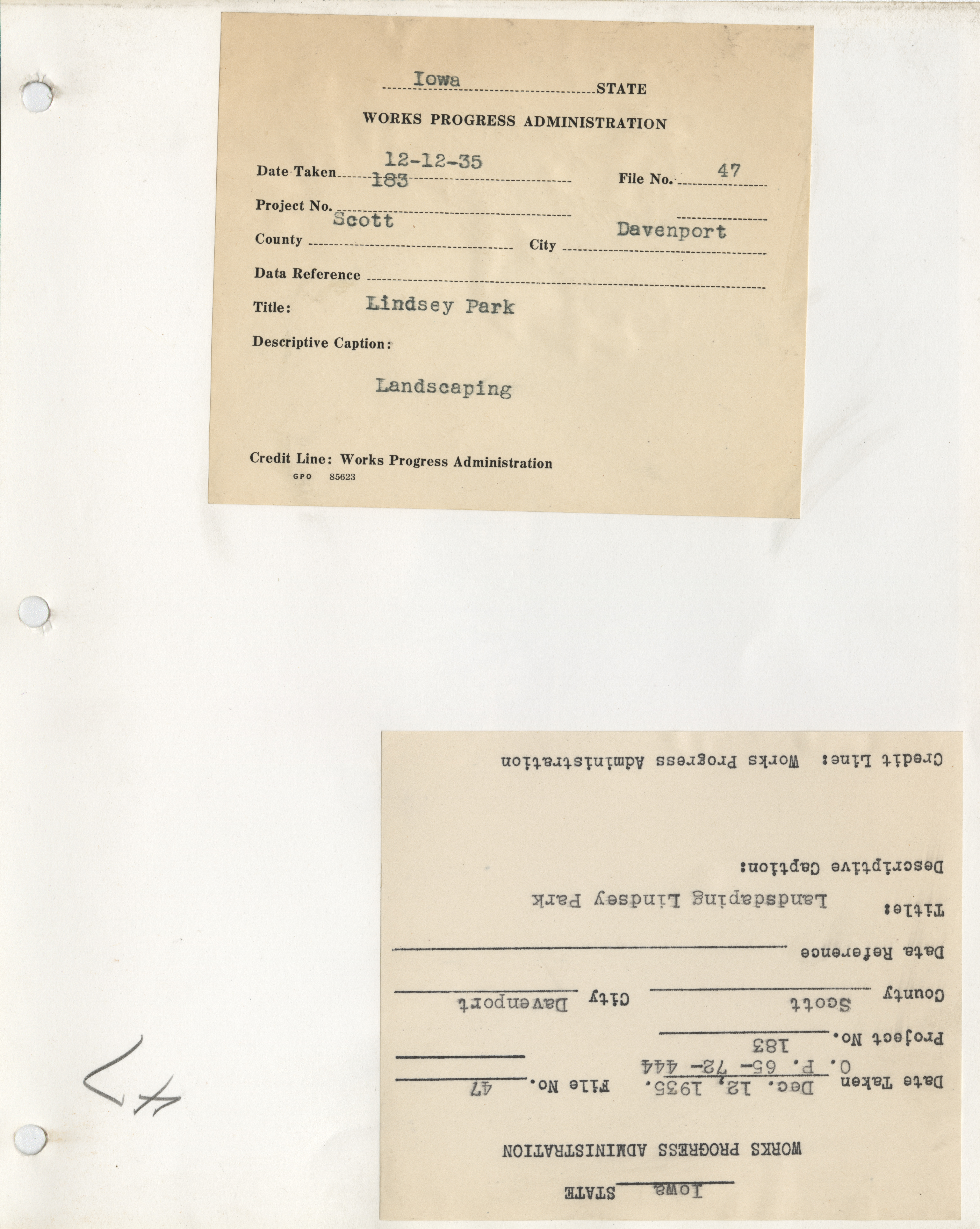 - "Photograph of people landscaping Lindsey Park in Davenport", Work Projects Administration (Iowa) Photographs, Iowa State University Library Digital Collections