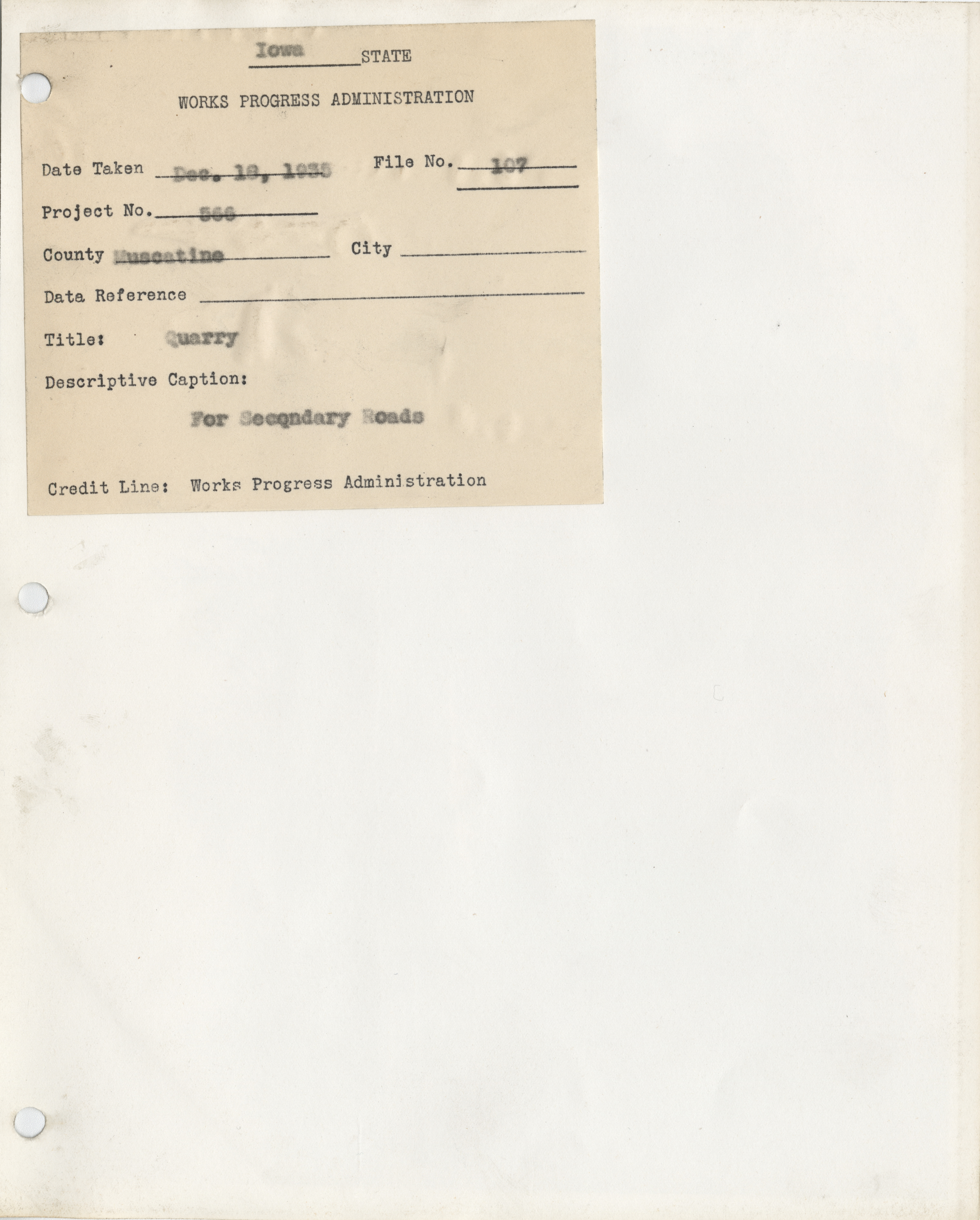 - District 2. Muscatine County. Quarry. Project 566. (1 b/w photograph), 1935