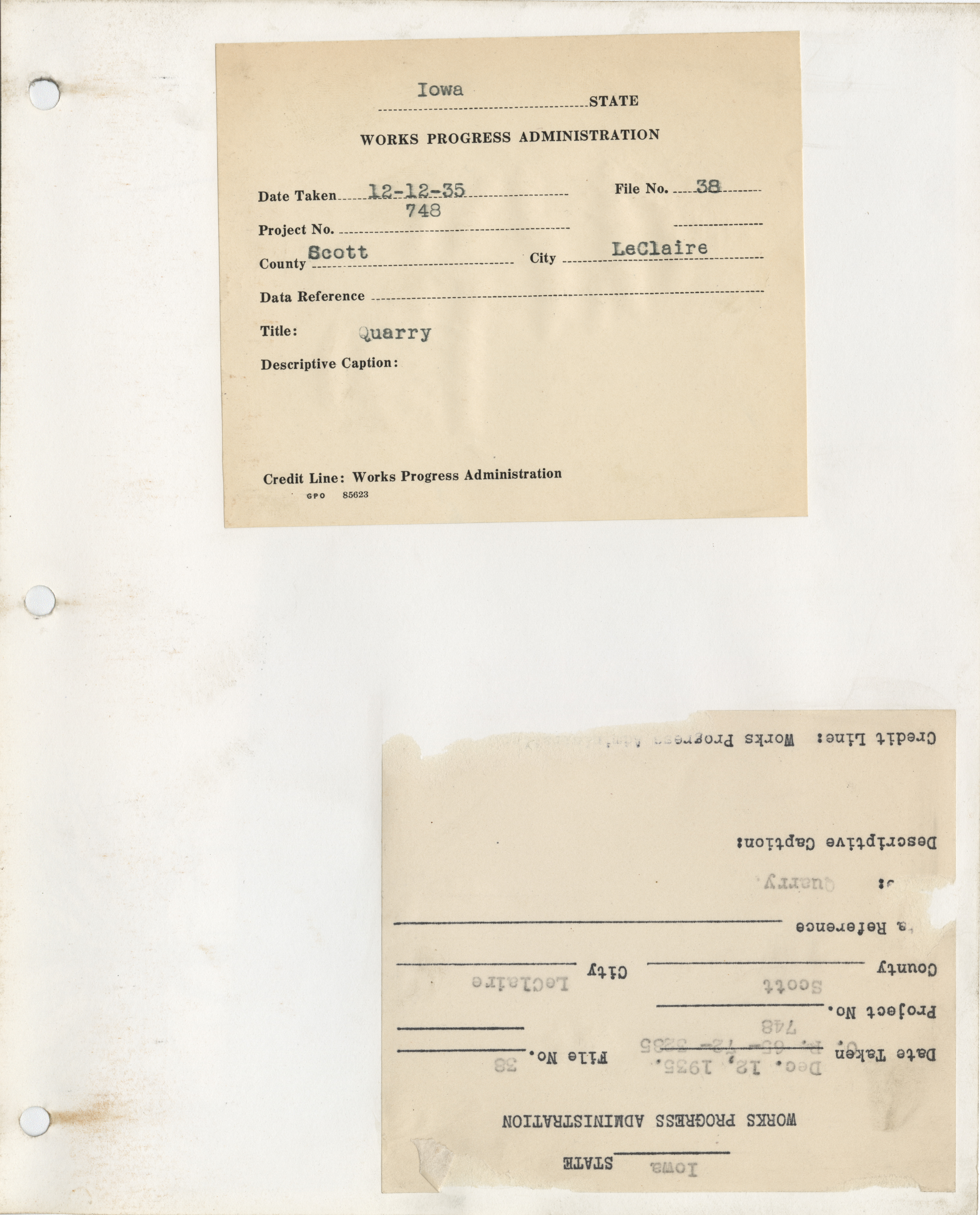 - District 2. Scott County. Le Claire. Quarry. Project 748. (1 b/w photograph), 1935