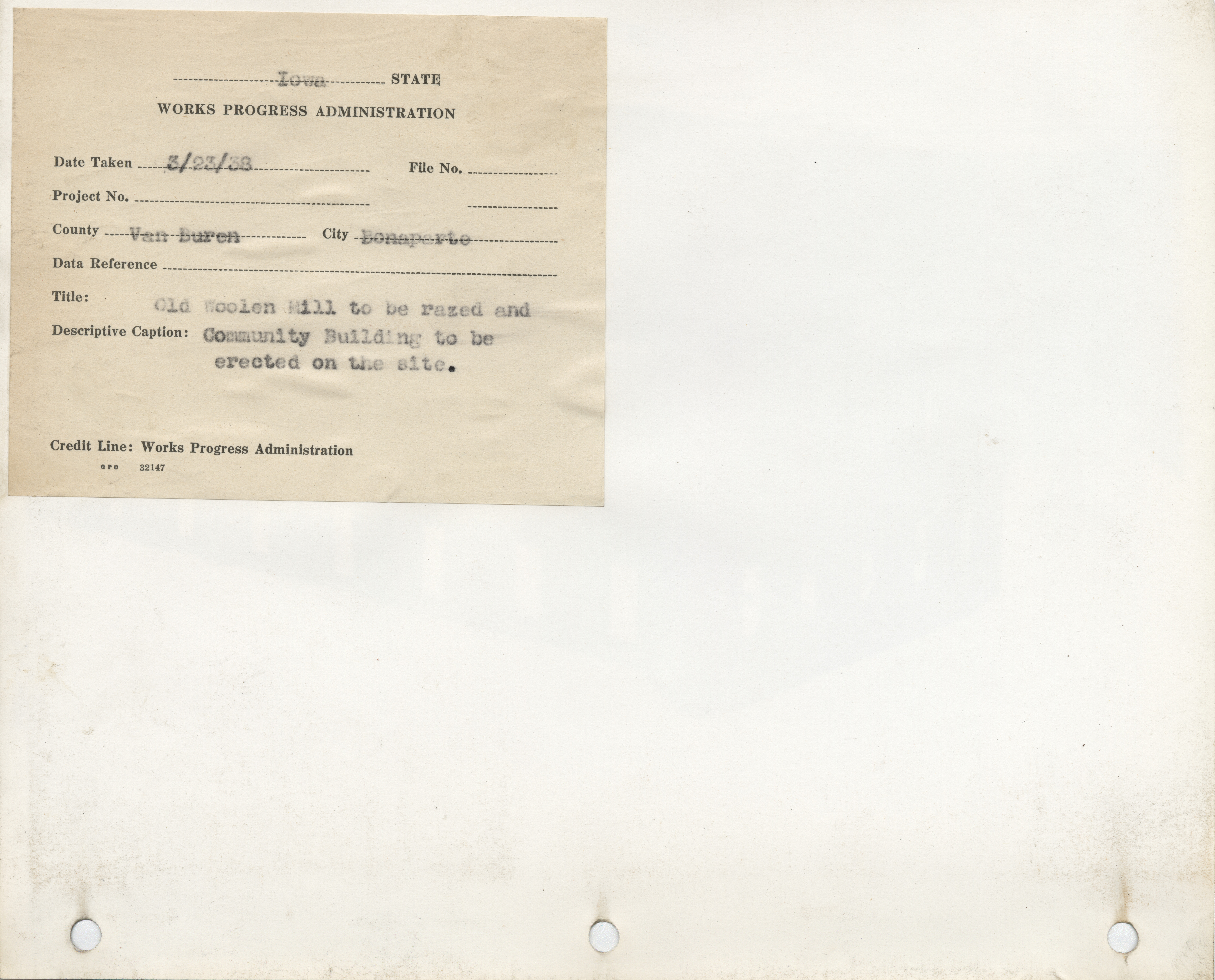- District 2. Van Buren County. Bonaparte. Woolen Mill to be Razed for Community Building. (1 b/w photograph), 1938