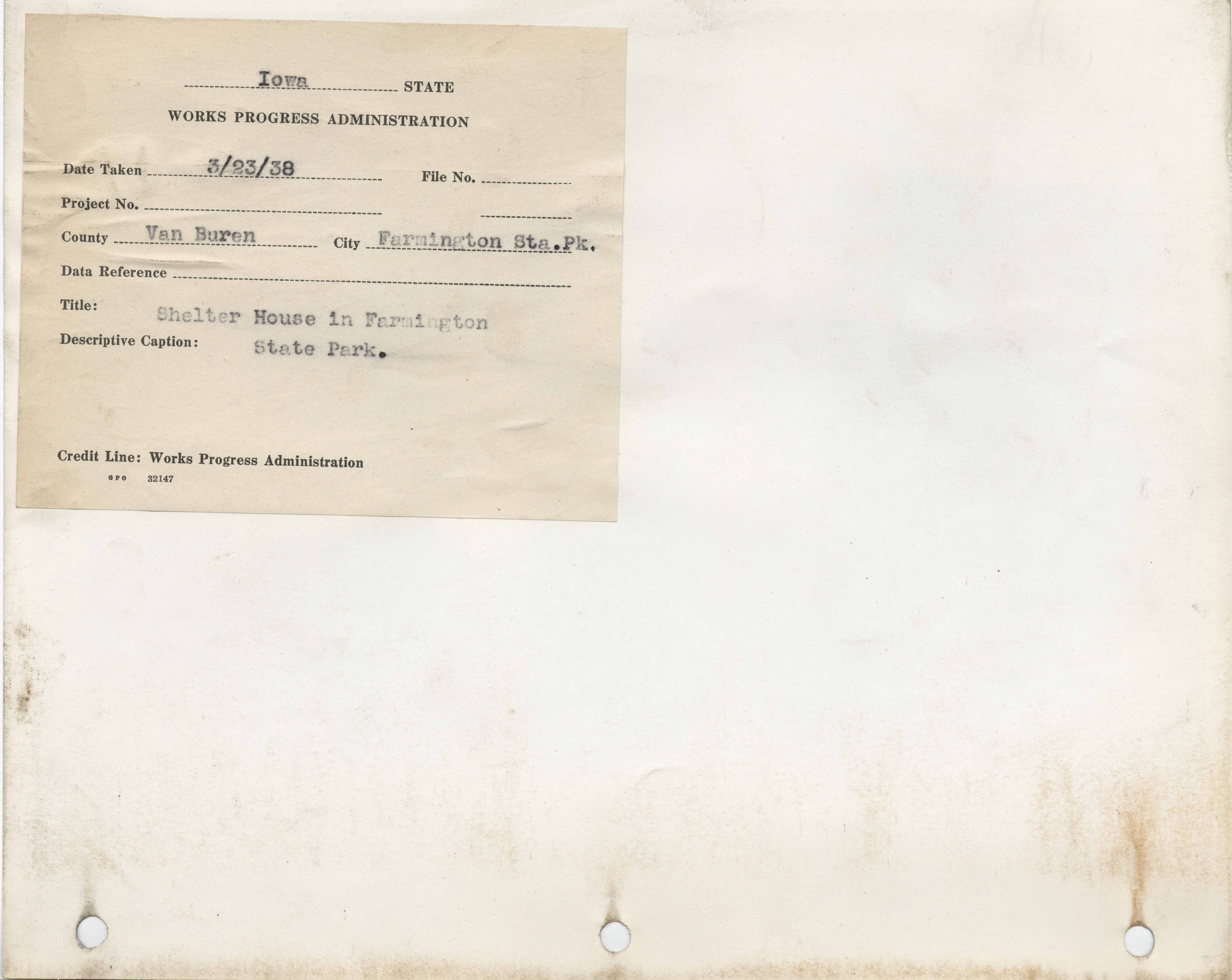 - "Photograph of a shelter house at Farmington State Park in Van Buren County", Work Projects Administration (Iowa) Photographs, Iowa State University Library Digital Collections