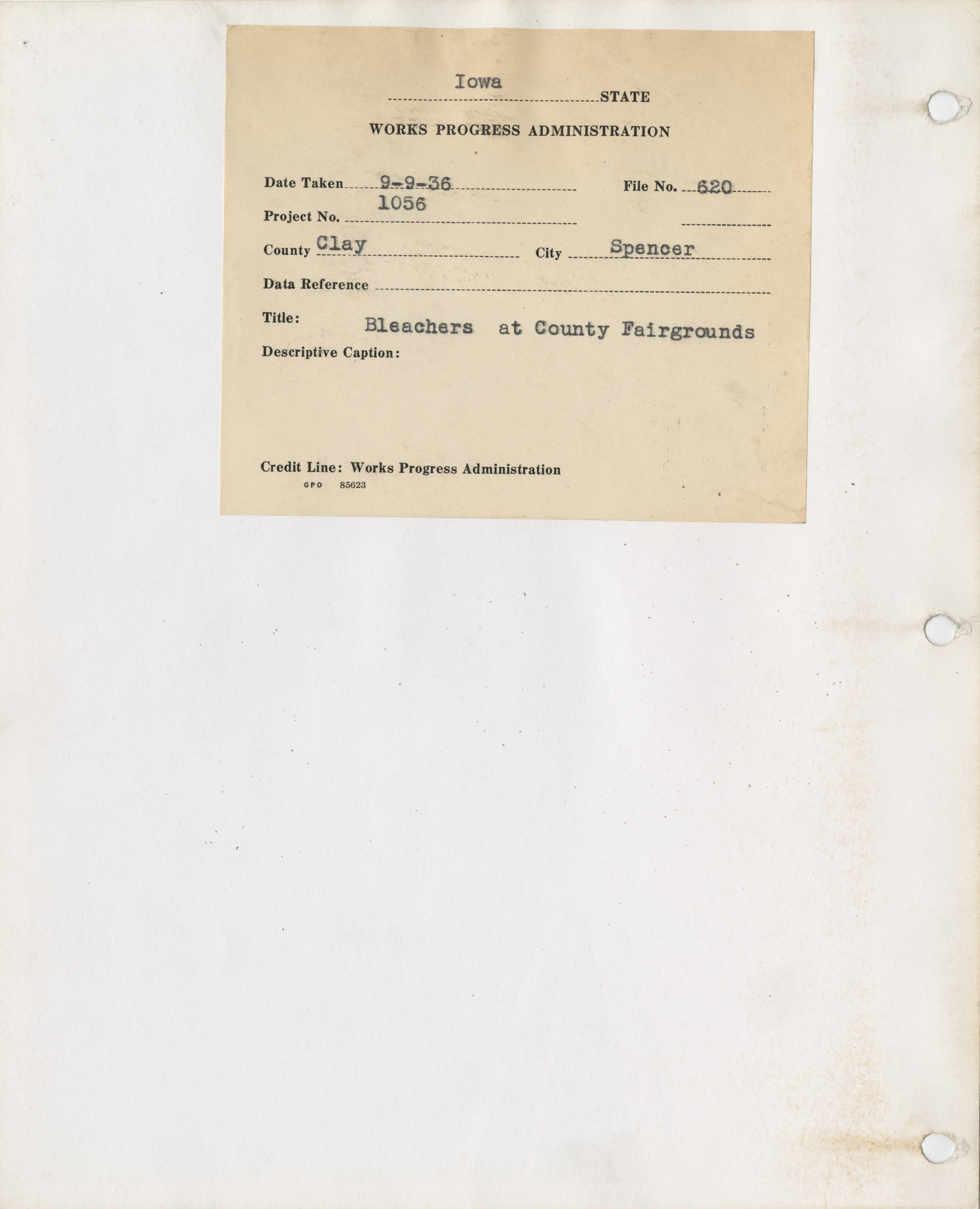 - "Photograph looking up at the bleachers at the county fairgrounds in Spencer", Work Projects Administration (Iowa) Photographs, Iowa State University Library Digital Collections