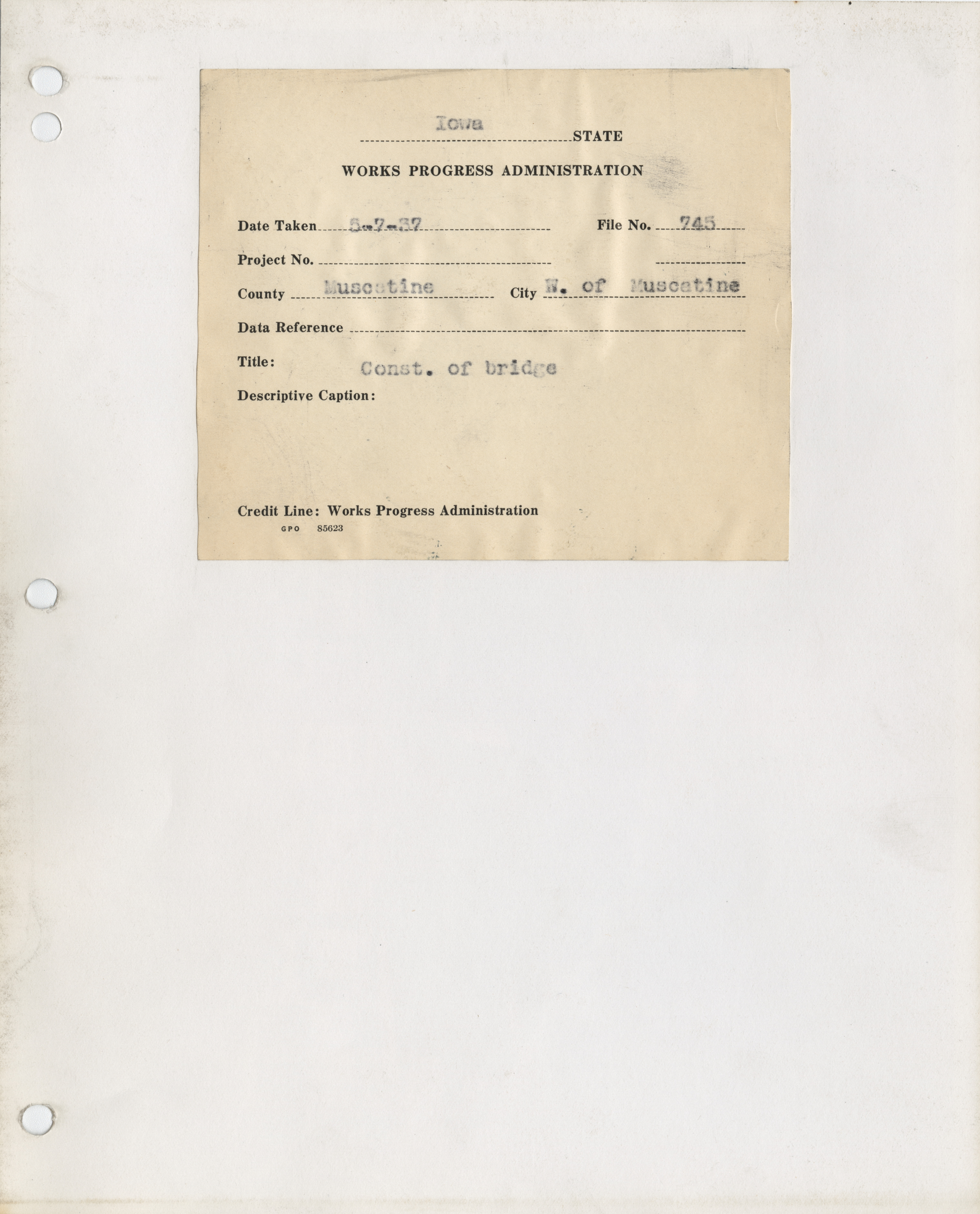 - "Photograph of people working on the construction of a bridge in Muscatine County", Work Projects Administration (Iowa) Photographs, Iowa State University Library Digital Collections