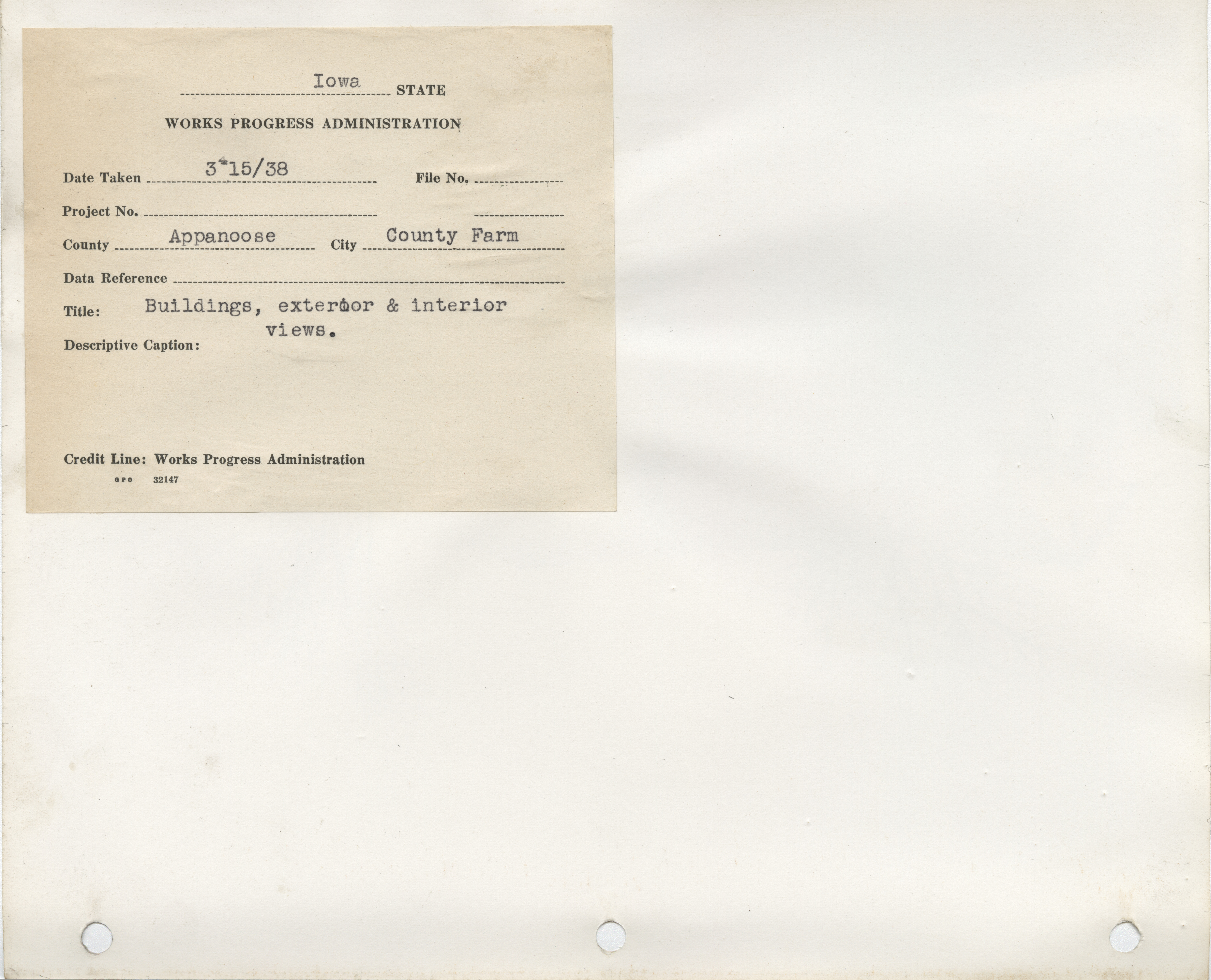 - "Photograph of buildings at a county farm in Appanoose County", Work Projects Administration (Iowa) Photographs, Iowa State University Library Digital Collections