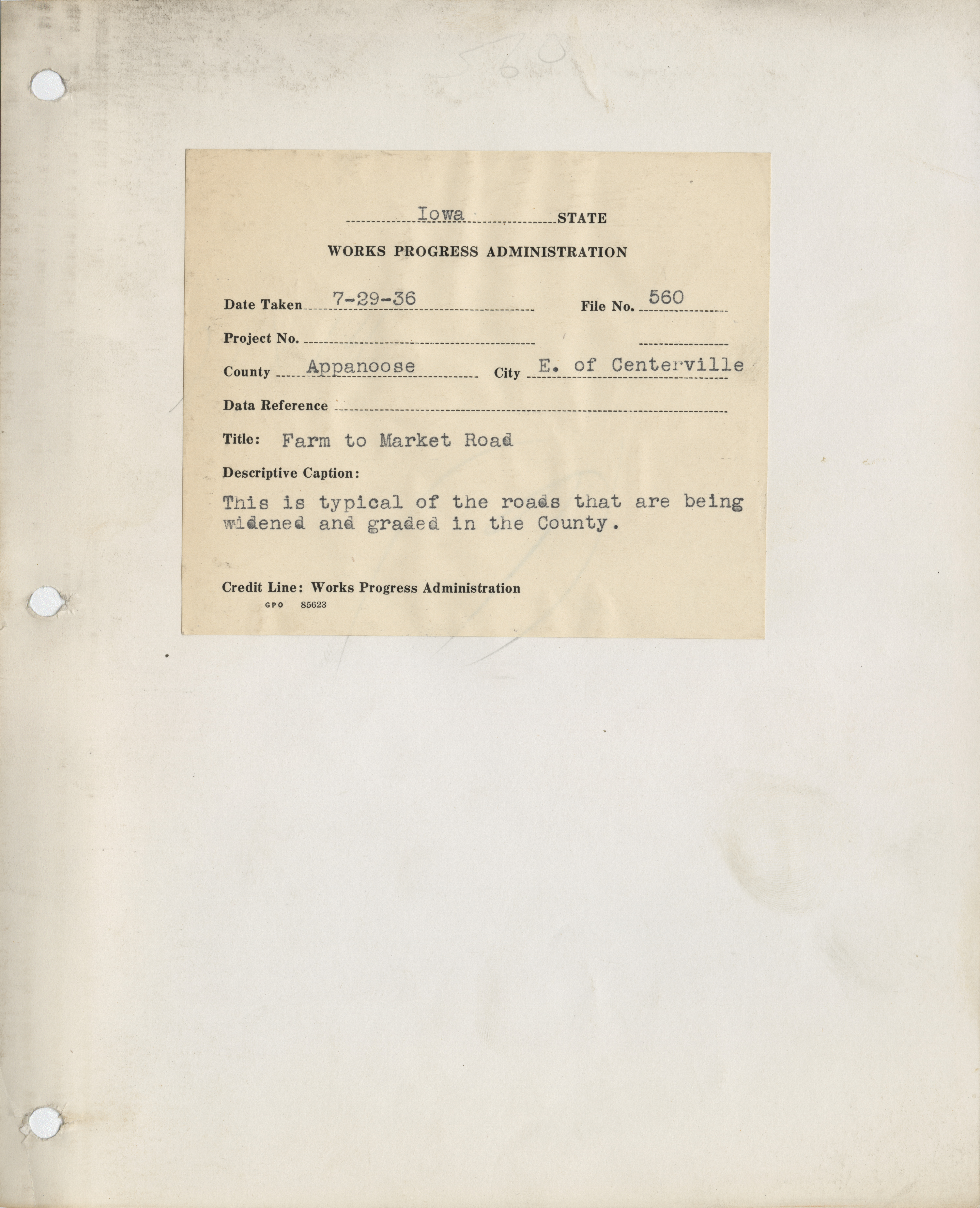 - "Photograph of a farm to market road in Appanoose County", Work Projects Administration (Iowa) Photographs, Iowa State University Library Digital Collections