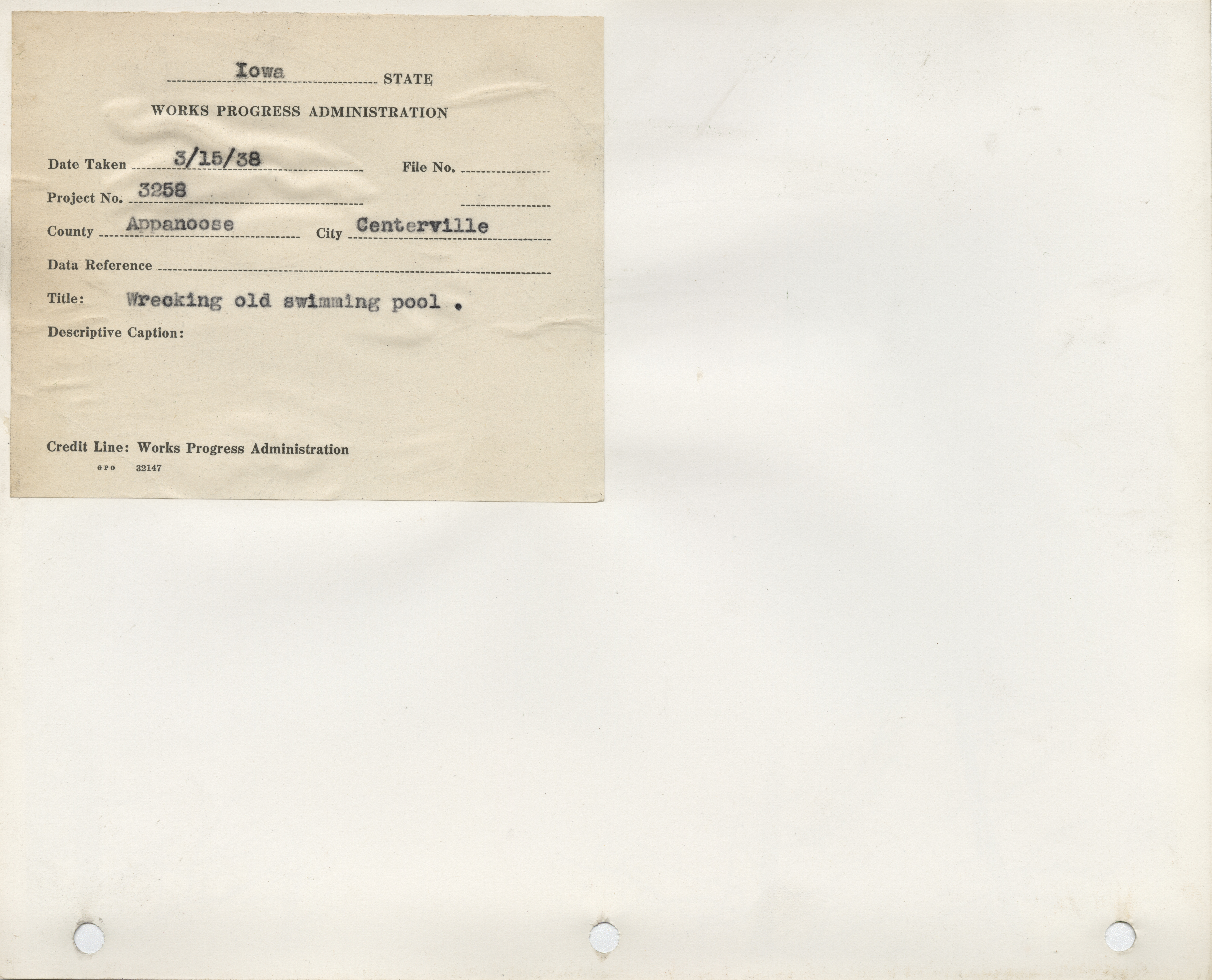 - "Photograph of the demolition of an old swimming pool in Centerville", Work Projects Administration (Iowa) Photographs, Iowa State University Library Digital Collections