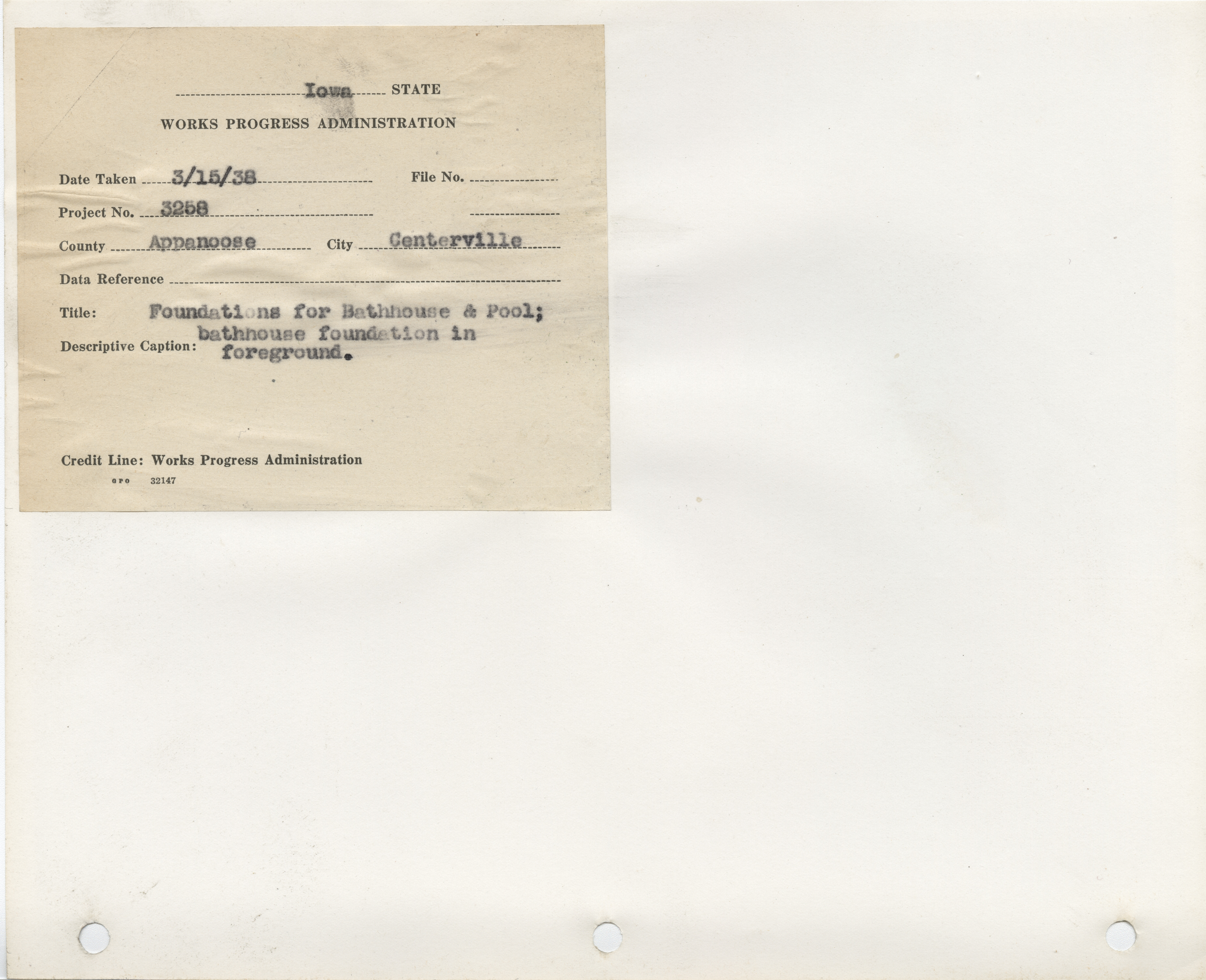 - "Photograph of the foundations for a new swimming pool and bathhouse in Centerville", Work Projects Administration (Iowa) Photographs, Iowa State University Library Digital Collections
