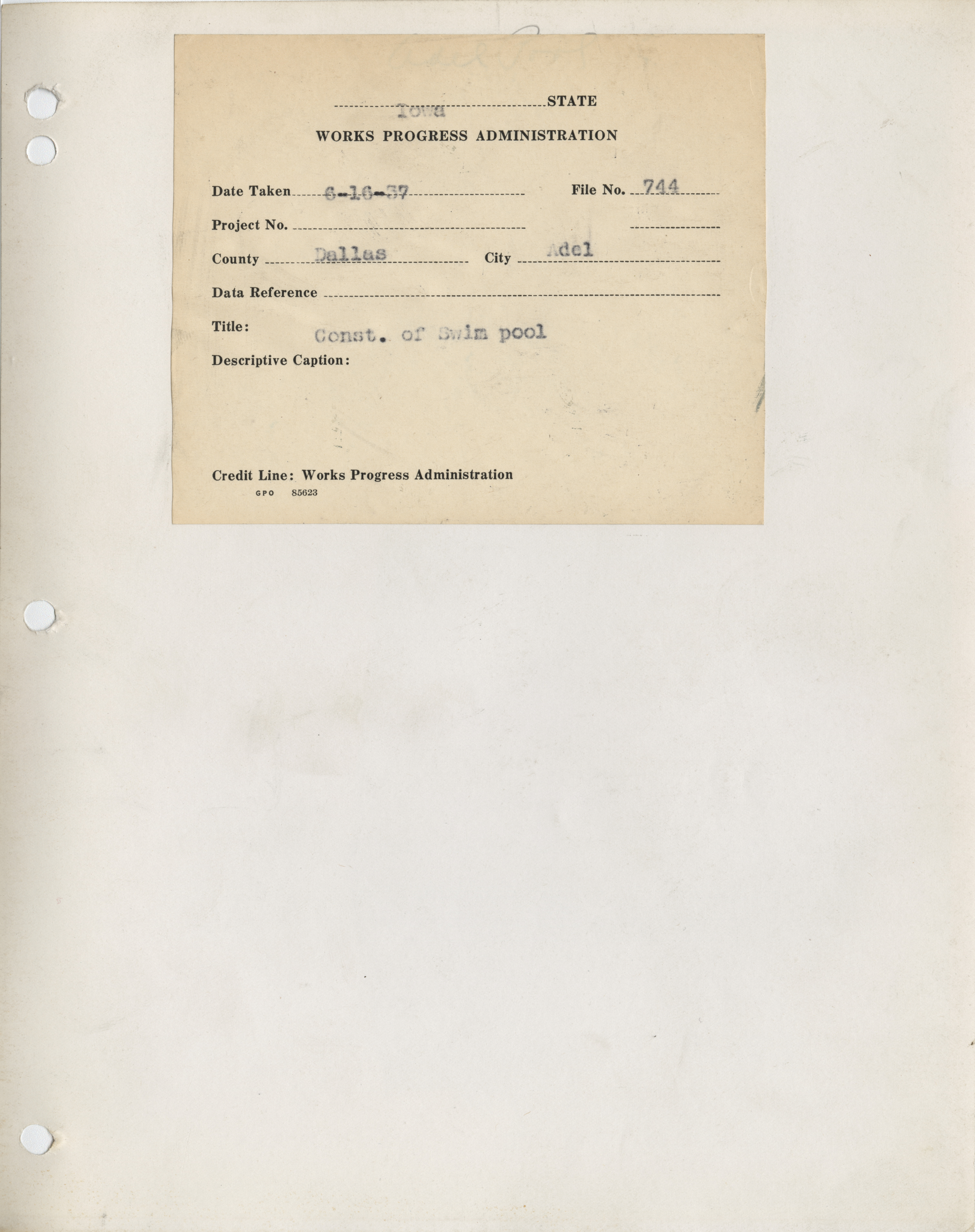 - "Photograph of the construction of a swimming pool in Adel", Work Projects Administration (Iowa) Photographs, Iowa State University Library Digital Collections